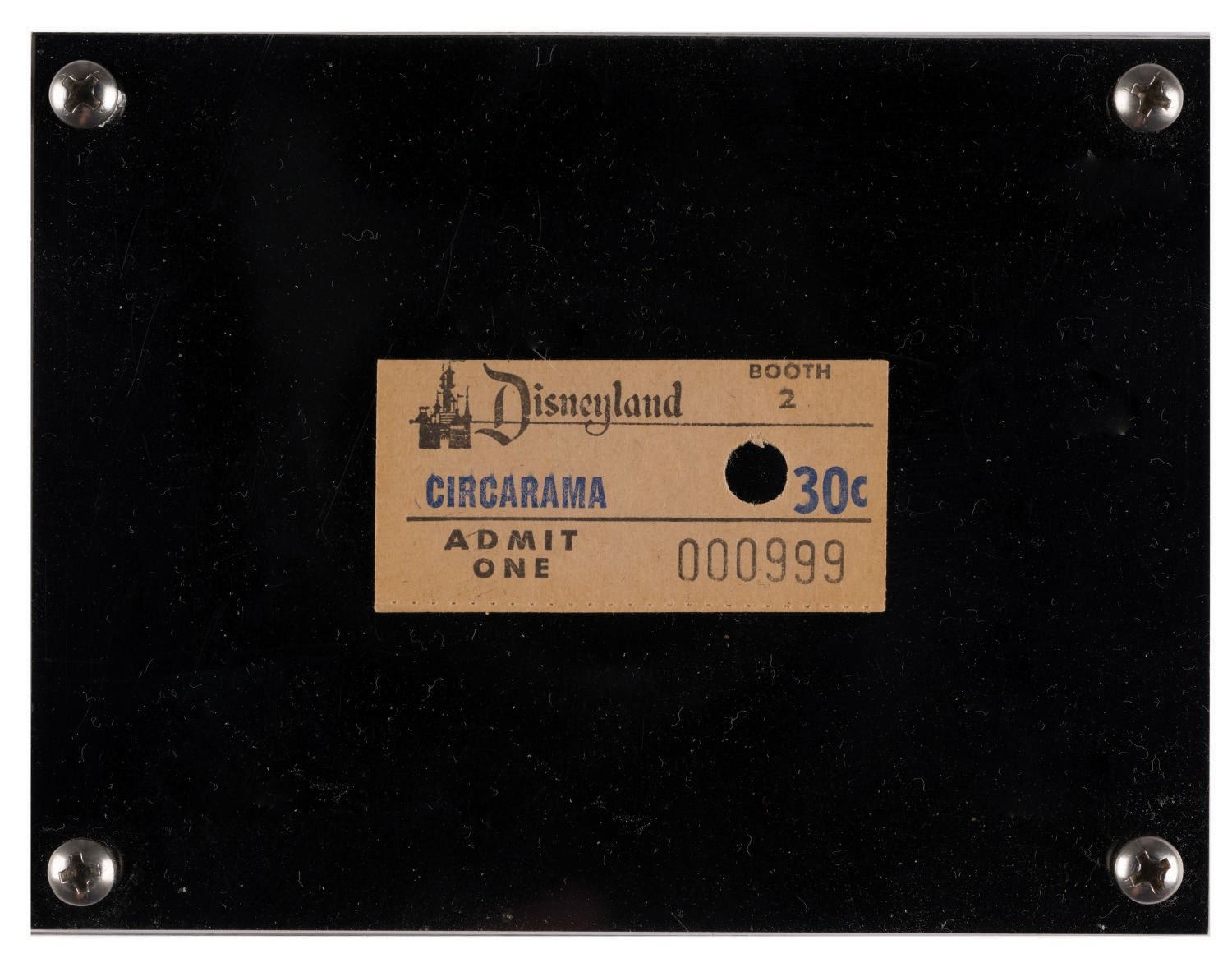 (Disneyland, c.1950s-60s) An admission media ticket for CirCARama at Disneyland. The ticket once admitted one Guest at a cost of 30 cents and retains a punched hole from Booth 2. Measuring 1"x2", the vintage ephemera is in fine as-new condition.