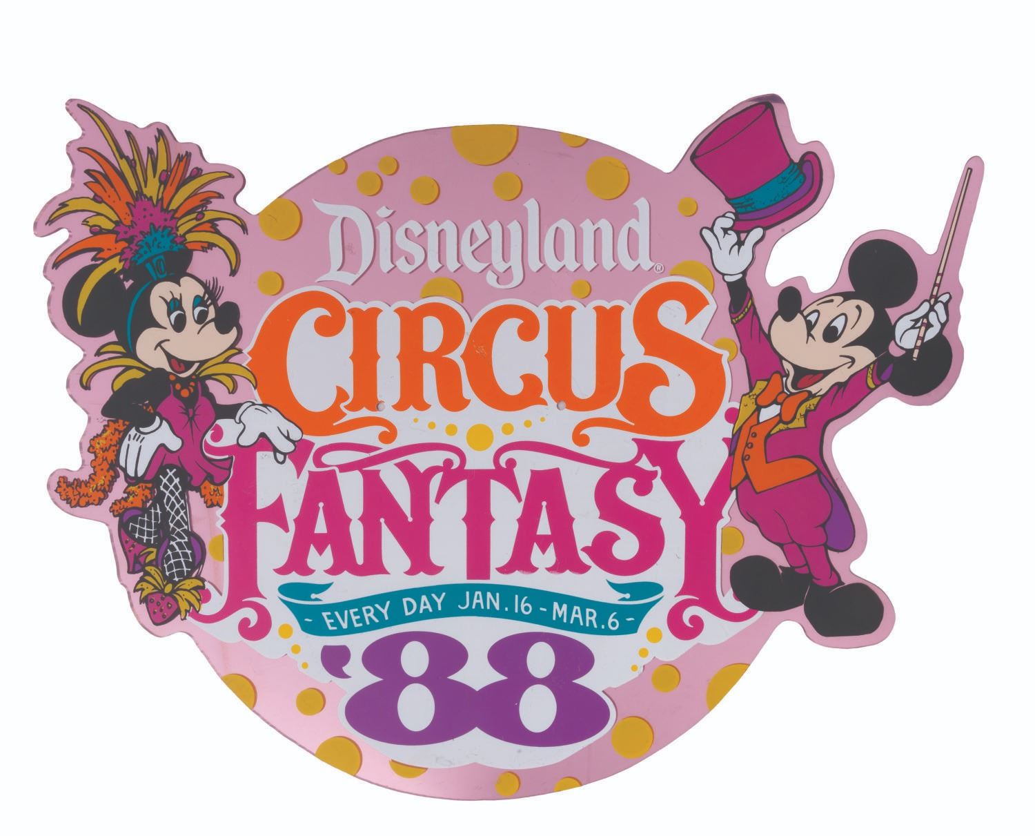 (Disneyland, 1988) A mirror-backed lamppost sign of Mickey and Minnie from the third and final season of Disneyland Circus Fantasy during the spring of 1988. Circus Fantasy ushered the Circus on Parade down Main Street for one final season, with a cavalcade of clowns, aerialists, and exotic animals. Measuring 20” x 25.5”, the acrylic sign with mirrored elements is in good condition with intended holes for display, heavy scratches, scuffs, and wear from Park use.