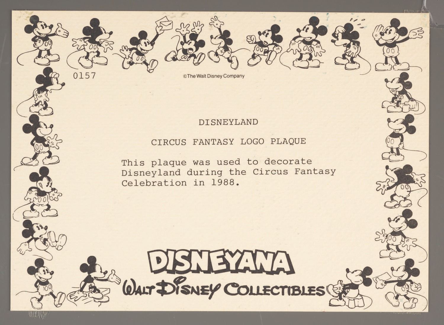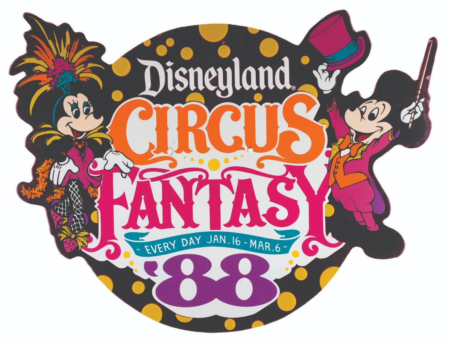(Disneyland, 1988) A rare mirror-backed lamppost sign of Mickey and Minnie from the third and final season of Disneyland Circus Fantasy during the spring of 1988. Circus Fantasy ushered the Circus on Parade down Main Street for one final season, with a cavalcade of clowns, aerialists, and exotic animals. Measuring 20" x 26", silkscreened on acrylic board, the sign is in good overall condition with some scuffs and light scratches from its original use, and light oxidation around the intended holes from original Park display. Included is a Disneyana Walt Disney Collectibles COA.