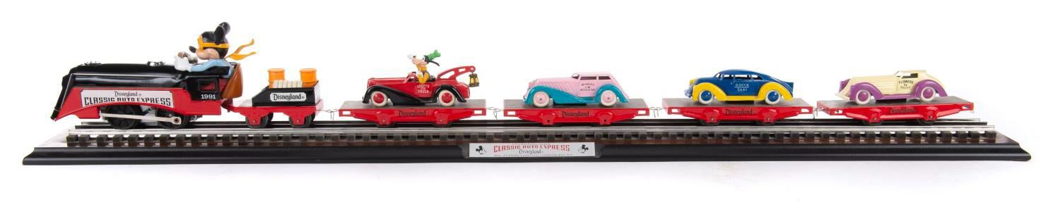 (Pride Lines, 1991) A Disneyland Classic Auto Express by Pride Lines. This "O" gauge train set was produced limitedly and comes complete with (5) cars carrying metal and polyester automobiles. Measuring 8" long, the motorized, "O" gauge locomotive and five 6.25" long cars display in fine condition atop a 40"x4.25" wooden base with plaque.