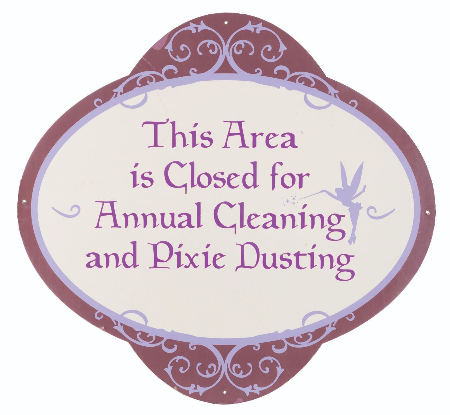 (Disneyland, 2010s) An area closure sign featuring Tinker Bell, reading "Annual Cleaning and Pixie Dusting." Measuring 34" x 36", the sign is in good condition, with wear from Park use including scratches and scuffs.