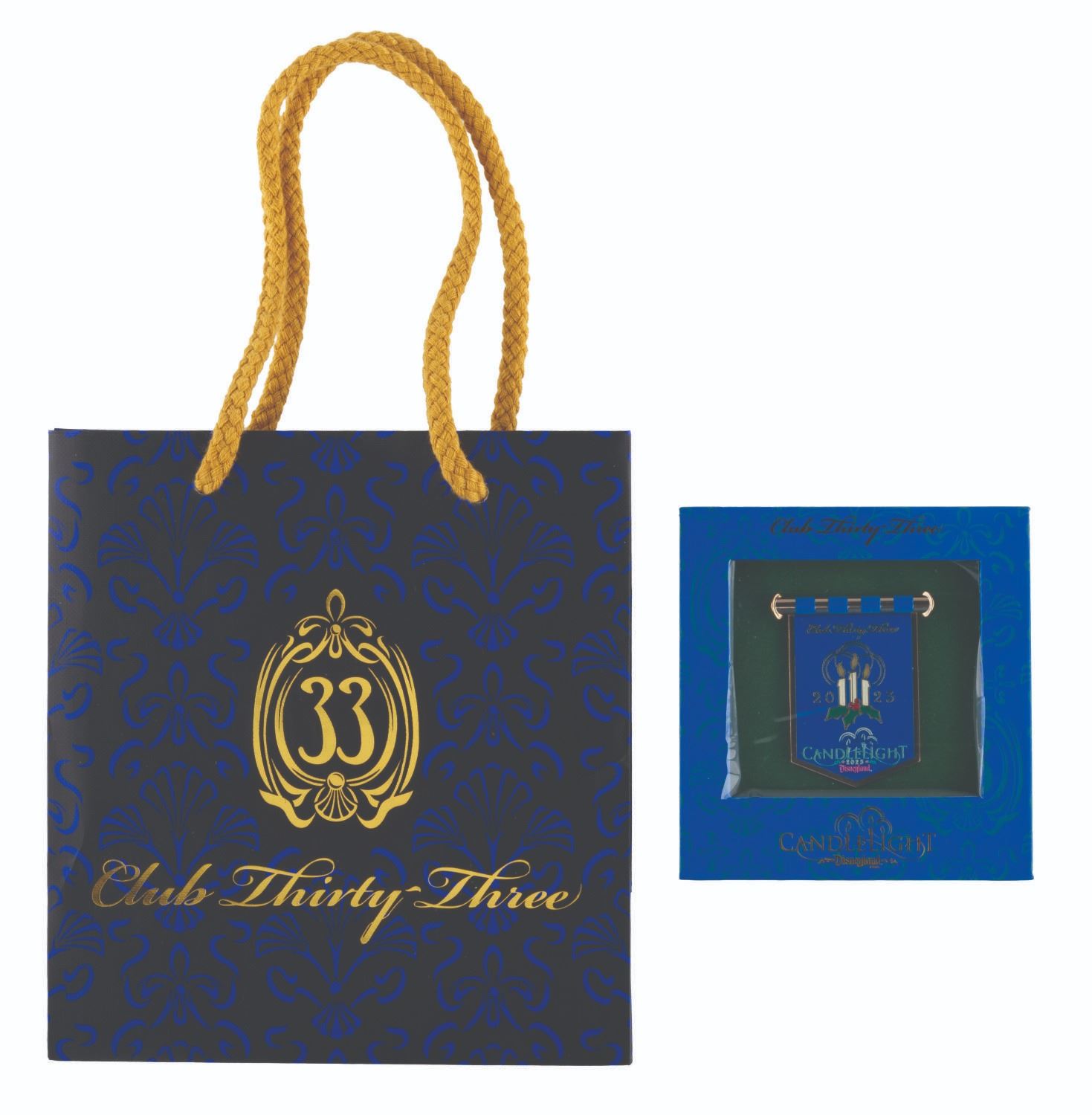 (Disneyland, 2003) A Club 33 Candlelight pin with the original box. The exclusive pin was released for the 2023 Holiday Season in a limited edition of 600. Included is a Club 33 shopping bag. Measuring 1.75” x 2” in its original 3.5” x 3.75” box and 6” x 6.5” bag, the pin is in very good condition with light surface scratches, while the bag exhibits creases.
