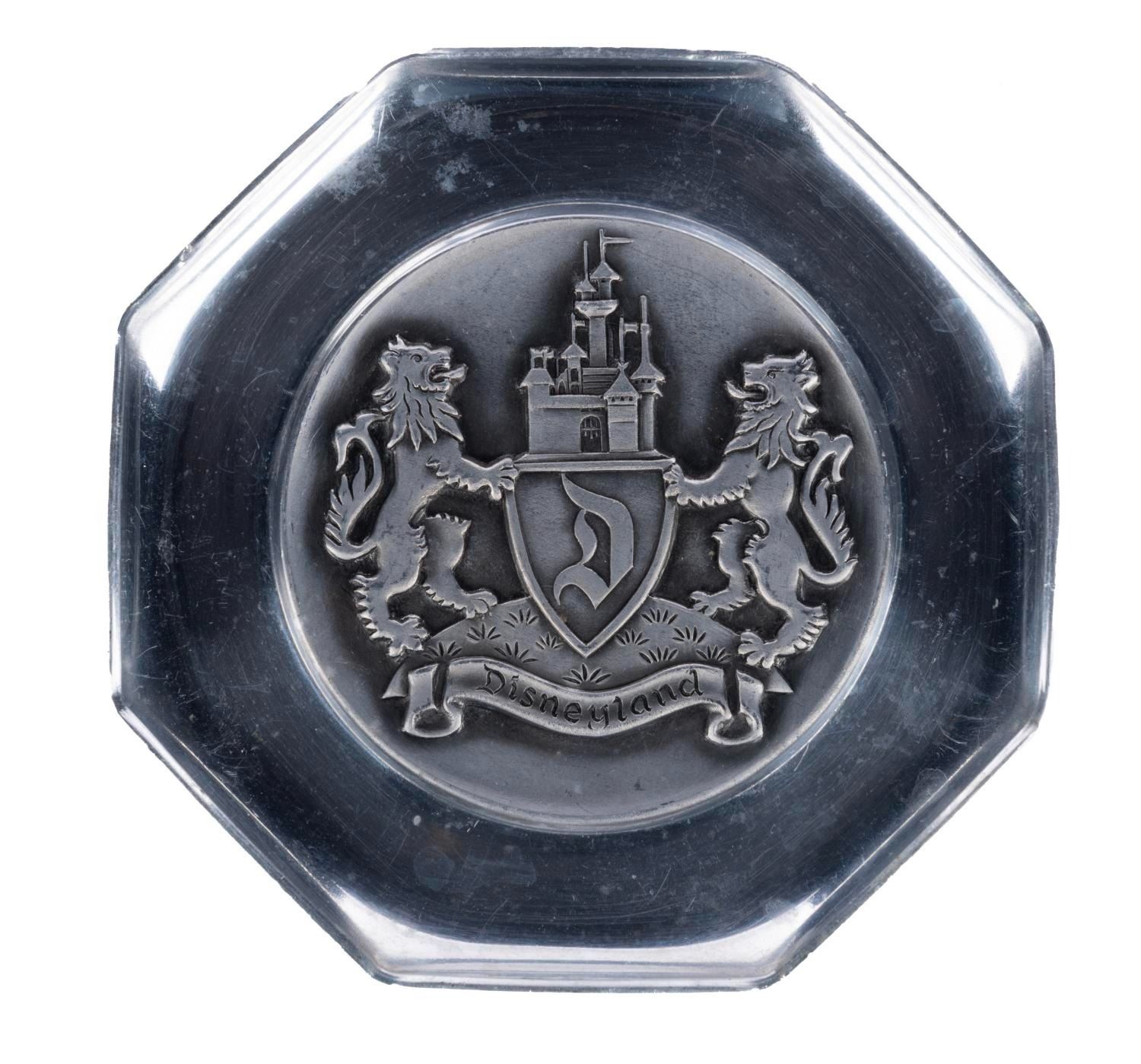(Disneyland, 1960s) A metal souvenir ashtray featuring the Disneyland coat of arms. Measuring 4.25"x4.25", the souvenir conversation piece is in very good condition with minor wear.