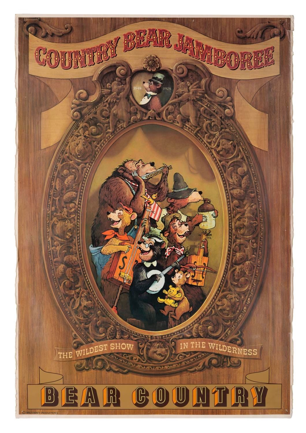 (Disneyland, 1972) An original lithographic poster for the Country Bear Jamboree at Disneyland. This attraction poster was one of the first to be created utilizing WED Print Shop’s four-color lithography process rather than the costly silk-screen process. The poster art was originally created for display at the Magic Kingdom, while this version has a silk-screened "Bear Country" added for the location at Disneyland. Designed by Jim Michaelson, Marc Davis, and Eddie Martinez, the artwork depicts the one and only, original Five Bear Rugs, headlining act of the Country Bear Jamboree. Measuring 37"x54”, the poster is in fair condition with heavy edge wear mostly affecting only the border, small creases throughout, a 1” tear to the top right corner, and ten nail holes from previous display.