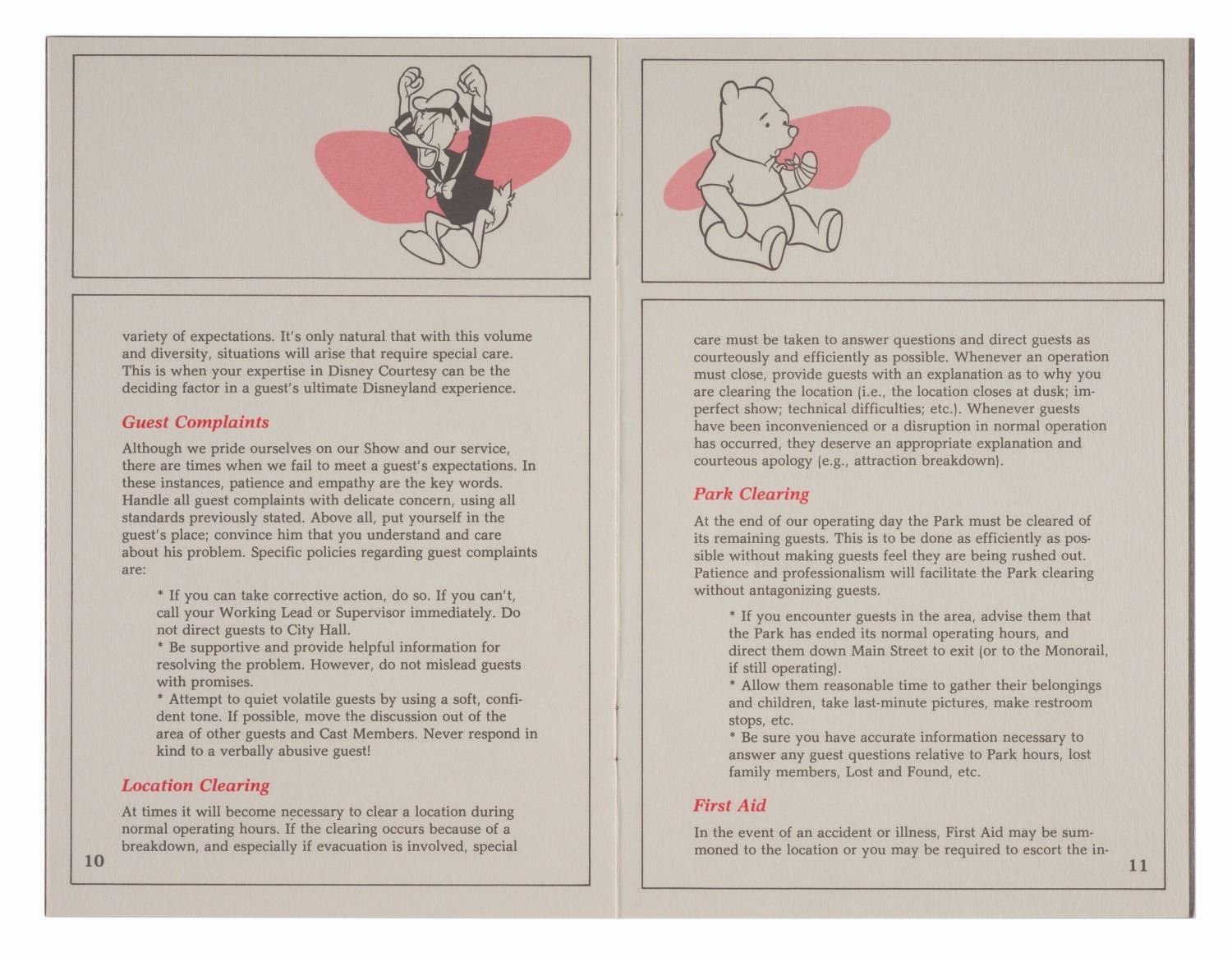 (Disneyland, 1989) A "Disney Courtesy Policies" book by the Disney University for Disneyland Cast Members. The 12-page guide ensures the achievement of courtesy and outstanding guest service through the practice of specific policies, tools, and techniques. Measuring 8.5"X5.5", the book is in very good condition, exhibiting little wear.