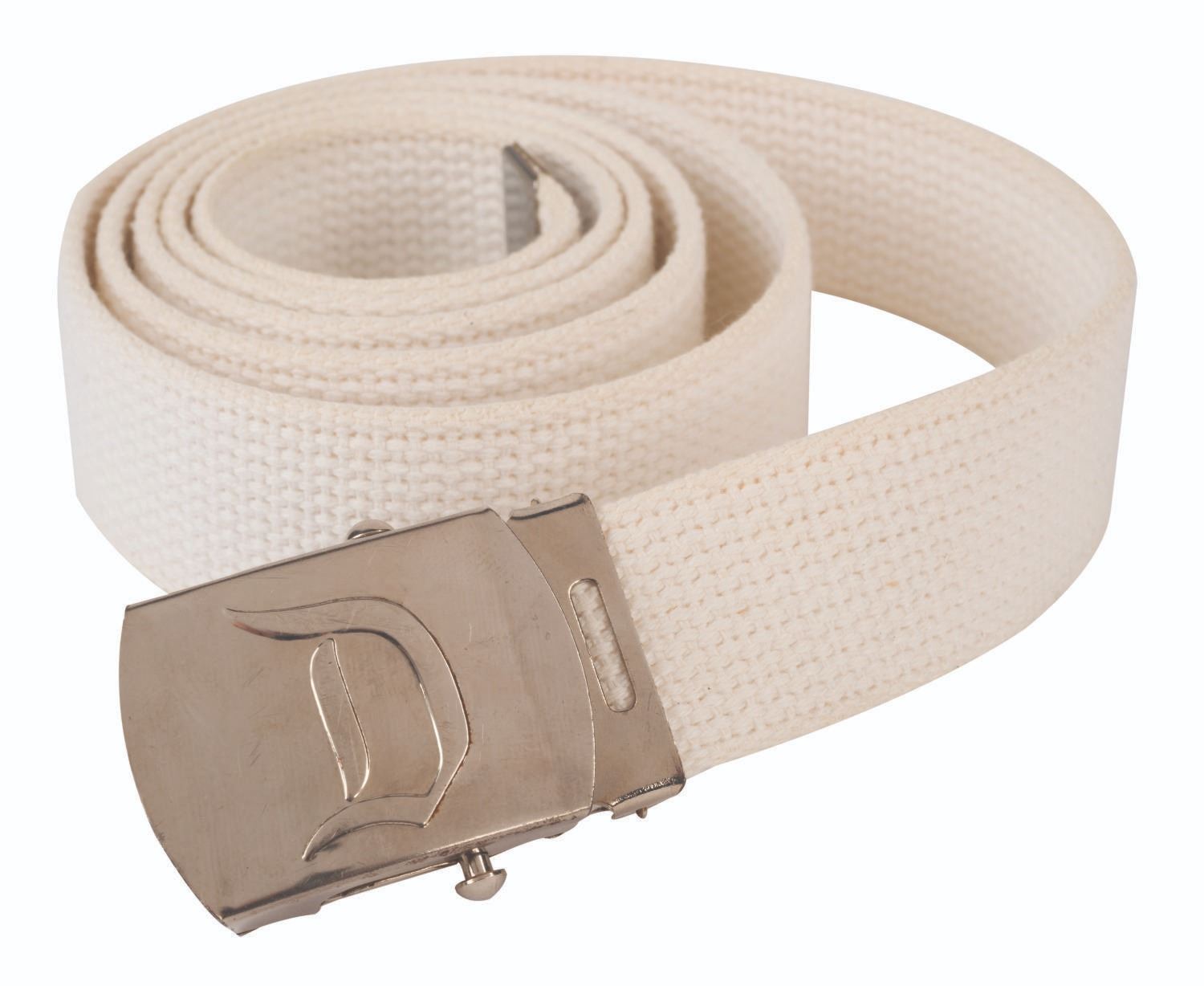 (Disneyland, 1960s-70s) A white fabric belt with a Disneyland "D" buckle from a Custodial uniform. Measuring 53.5" x 1.75", the belt is in very good condition with small spots of oxidation on the back of the buckle.