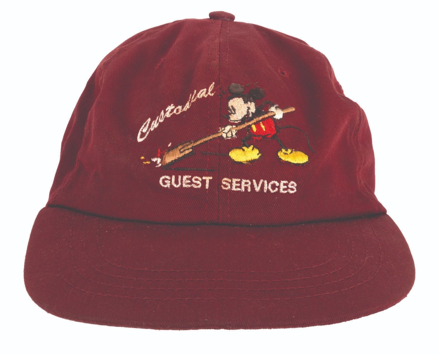 (Disneyland, 1980s-1990s) A burgundy Disneyland Custodial Guest Services hat featuring Mickey Mouse pushing a broom. Measuring one size fits most with an adjustable plastic strap, the hat is in good condition with stains and wear from use and a black mark under the visor.