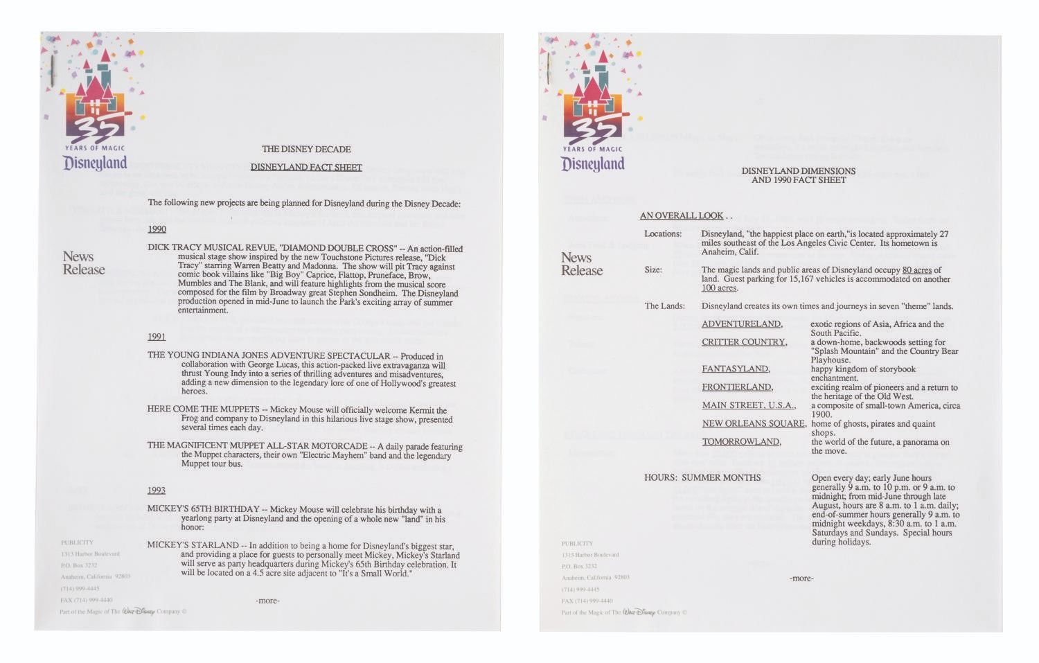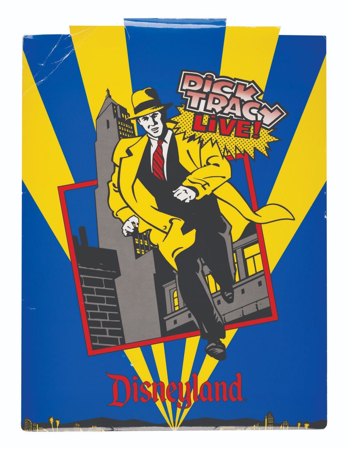 (Disneyland, 1990) A press kit announcing, "Dick Tracy Live!" in Videopolis at Disneyland. The folder and contents were prepared for media members by The Walt Disney Company Public Relations Department and include (6) News Releases on the adaptation from comics to screen to stage at Disneyland, (9) promotional photos with captions detailing the action of the stage spectacular, and a "Mick Tracy" paper hat. Measuring 9"x12.25", the folder and contents are in very good condition with minor creases and wear throughout.