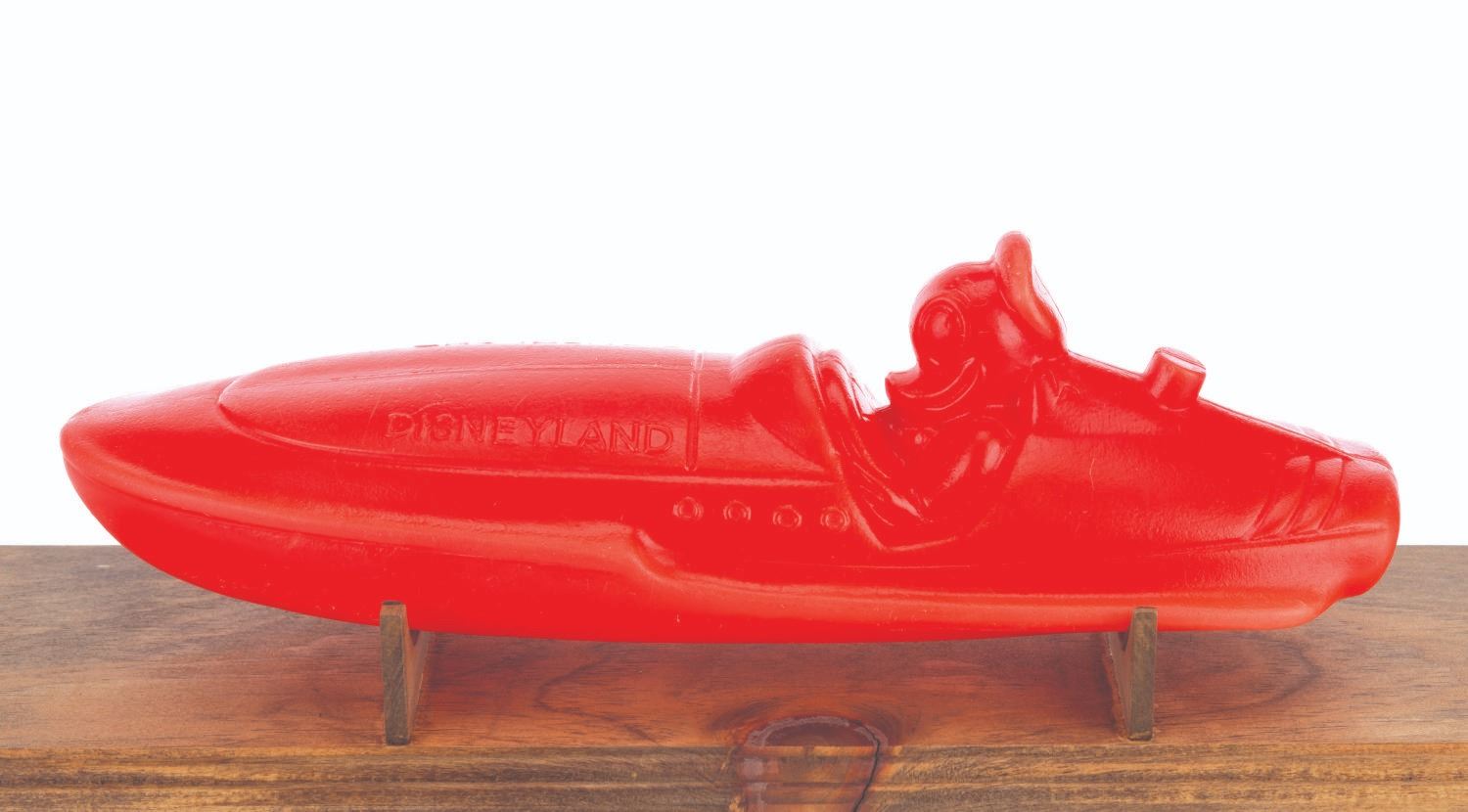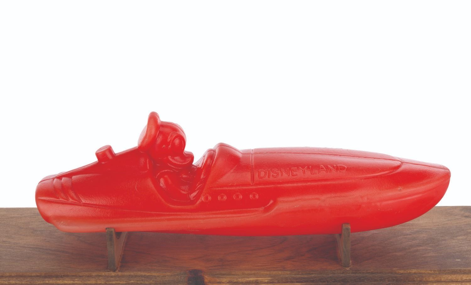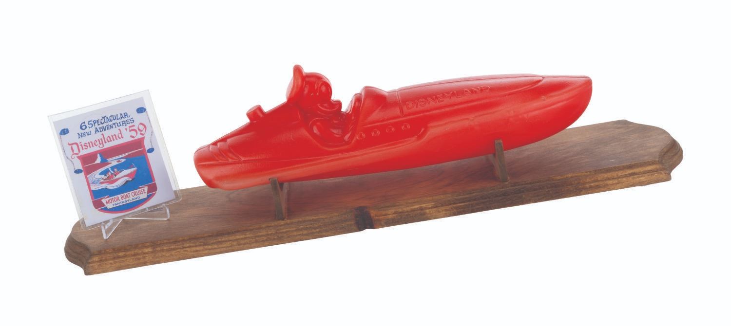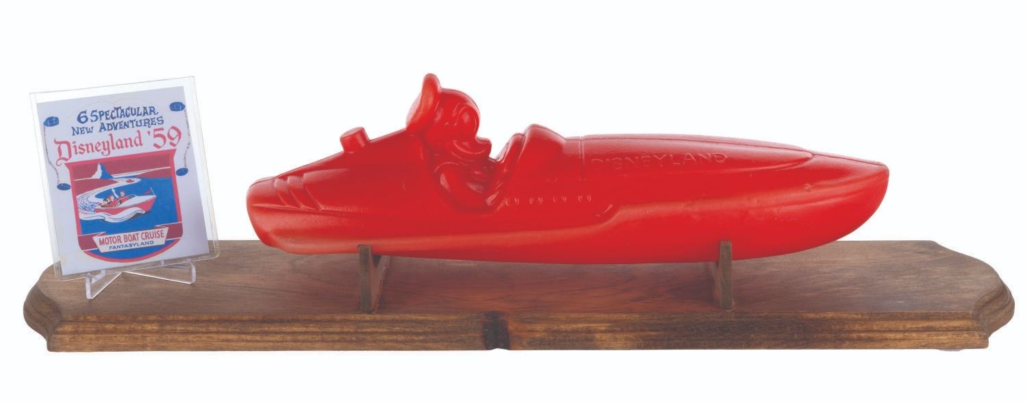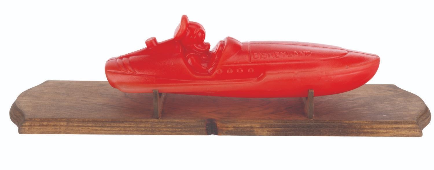 (Disneyland, 1960) A very rare red plastic boat toy from Disneyland featuring Donald Duck. This toy, which is modeled after the Motor Boat Cruise attraction, was created by Bayshore Inc and reads "Disneyland" on both sides of the boat. Measuring 5"x4" and 15" long, the toy is in good condition with some surface wear throughout from use, including scuffing and scratching. There is also minor fading to the color from age. The toy comes with a custom wood stand measuring 6"x23.25".