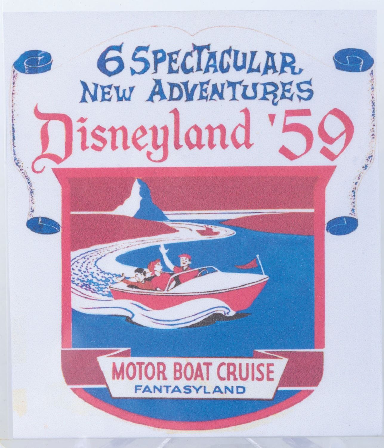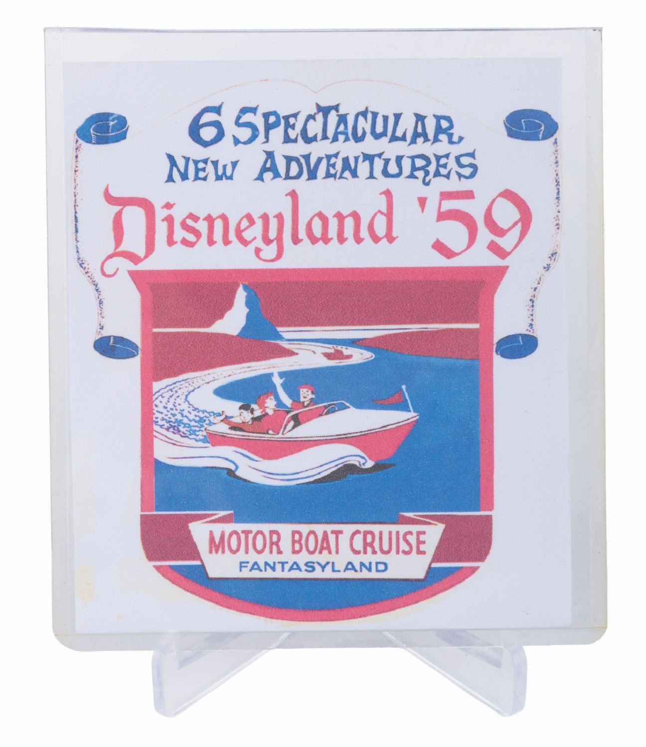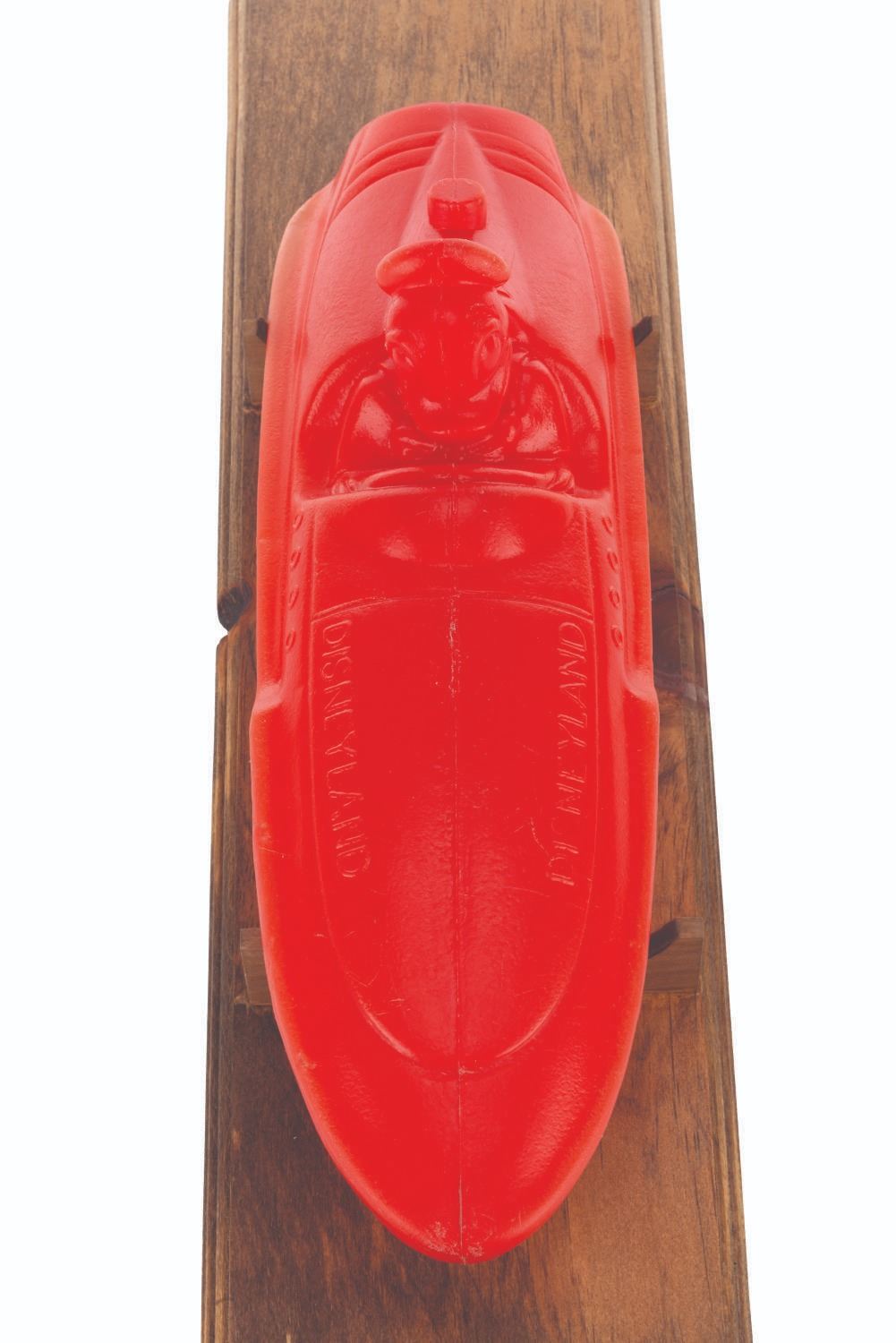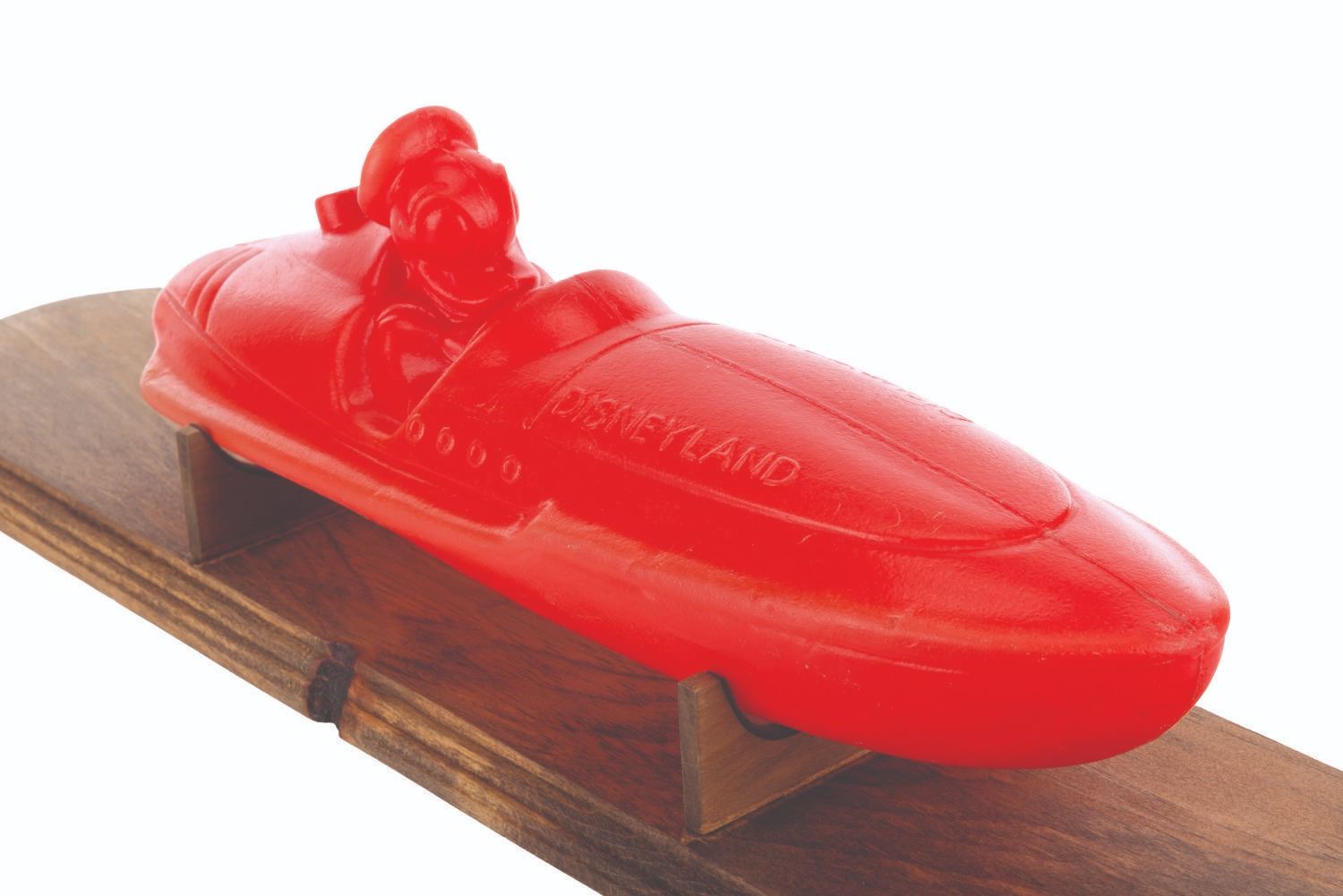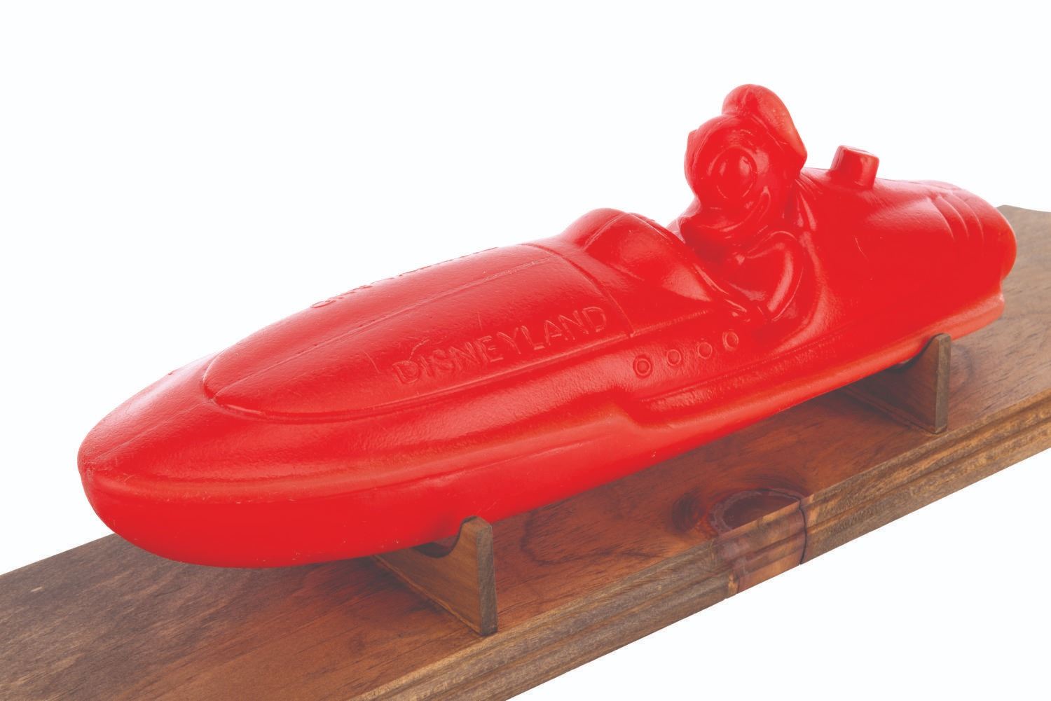 (Disneyland, 1960) A very rare red plastic boat toy from Disneyland featuring Donald Duck. This toy, which is modeled after the Motor Boat Cruise attraction, was created by Bayshore Inc and reads "Disneyland" on both sides of the boat. Measuring 5"x4" and 15" long, the toy is in good condition with some surface wear throughout from use, including scuffing and scratching. There is also minor fading to the color from age. The toy comes with a custom wood stand measuring 6"x23.25".