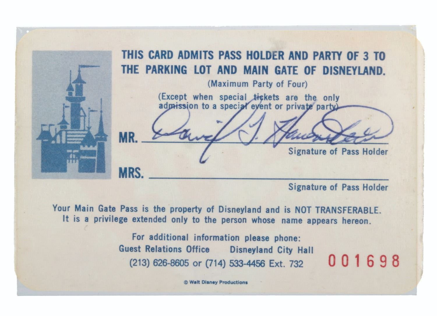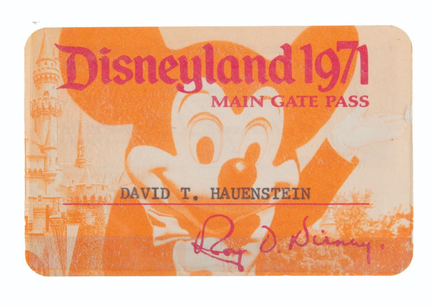 (Disneyland, 1971) A Main Gate pass featuring a facsimile of Roy O. Disney's signature and Mickey Mouse. The pass allowed a Disney Cast Member to enter Disneyland with up to three guests when they weren't working. Measuring 4" x 2.5", the pass is in very good condition with light edge wear and a signature from use.
