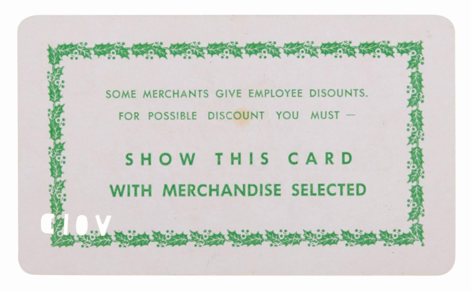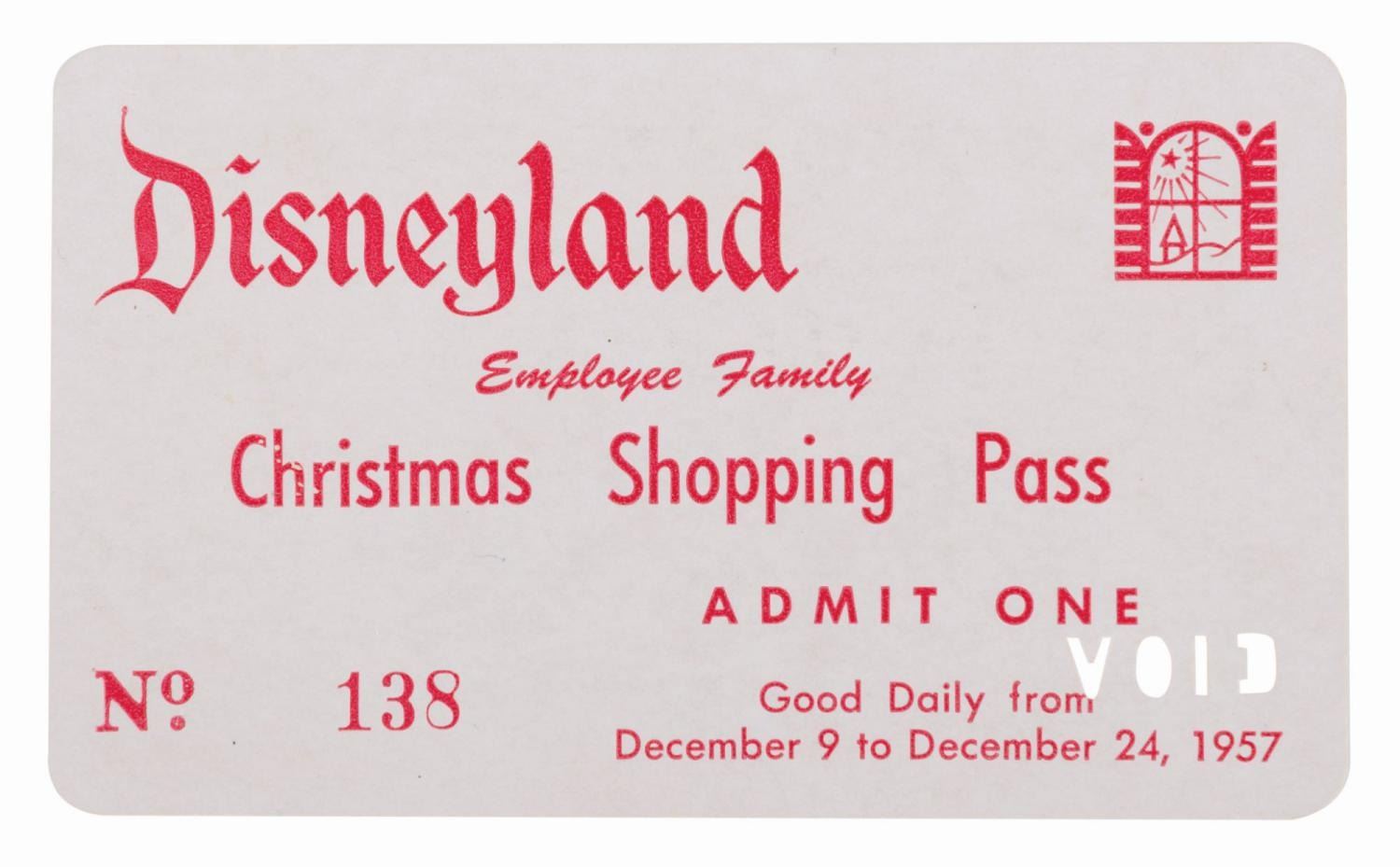 (Disneyland, 1957) A Disneyland Employee Christmas Shopping Pass. These admission cards granted relatives of Cast Members entry to the Park with discounts with some merchants at Disneyland and the Disneyland Hotel from December 9 to 24, 1957. Measuring 4" x 2.25", the card is punched “VOID” and in very good condition with light wear.