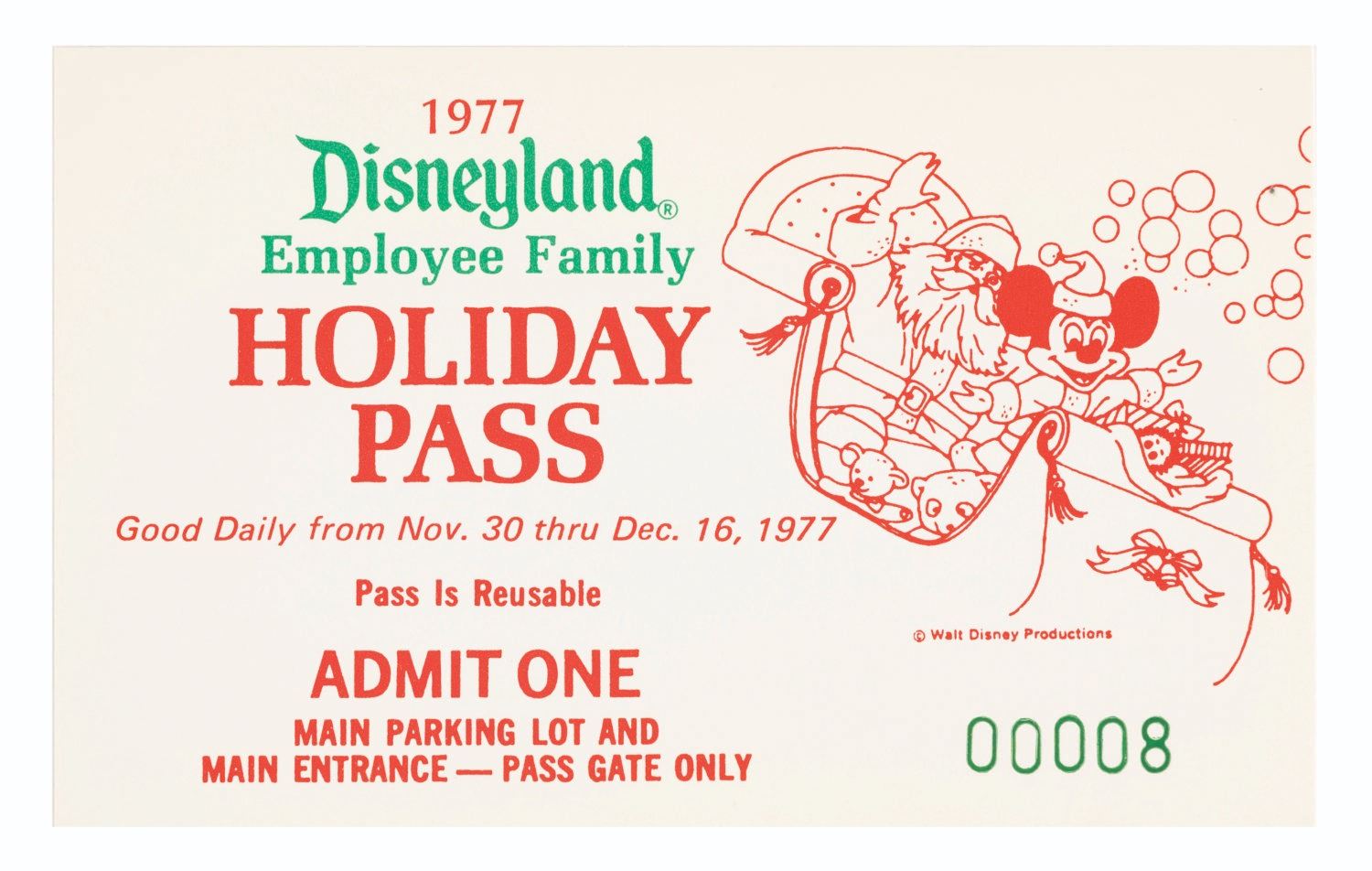 (Disneyland, 1977) A Disneyland Employee Family Holiday Pass from 1977. These passes were given to Disney employees and were redeemable for admission for themselves and their families to the Park during the holiday season. Numbered 00008 and measuring 2.5” x 3.75”, the pass is in fine condition.