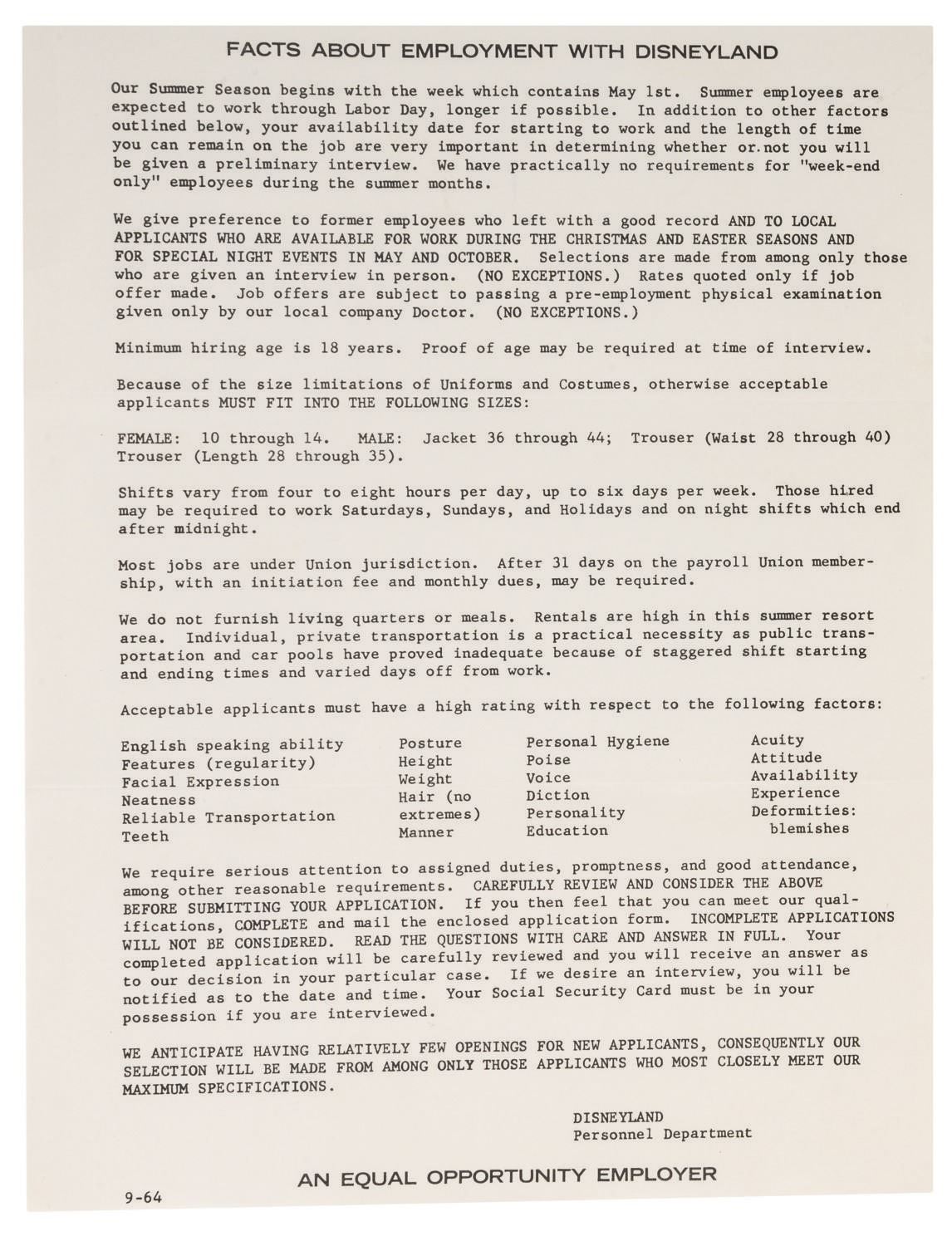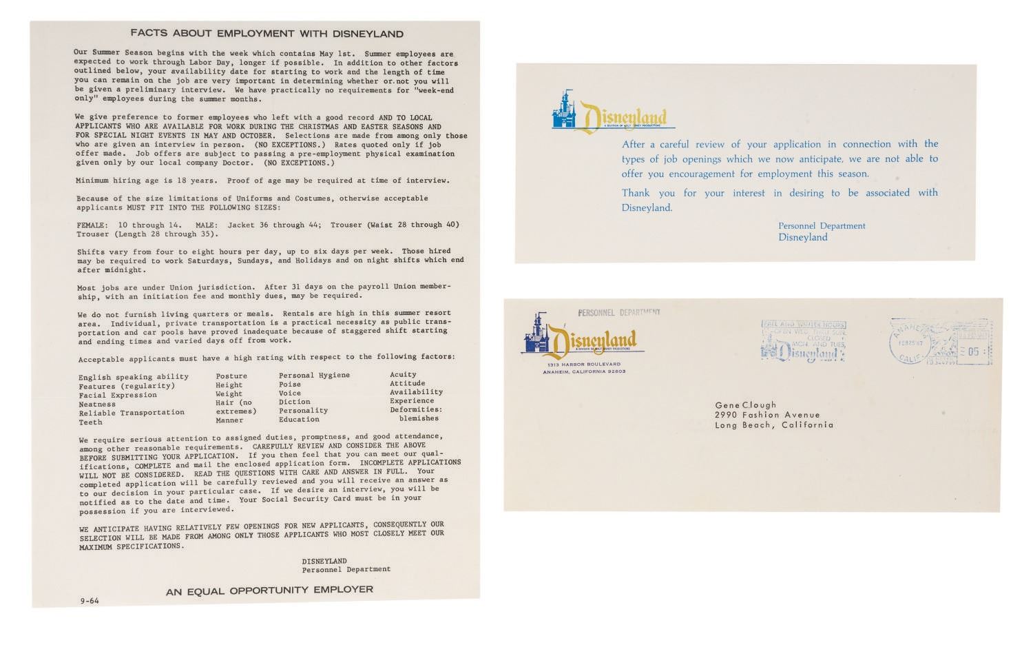 (Disneyland, 1967) An employment rejection letter from the Disneyland Personnel Department in 1967. The brief note gently but firmly informs the applicant that Disneyland "could not offer encouragement for employment," and includes both a sheet of Facts About Employment, and an envelope with interesting postmark showing the park's fall and winter hours. Measuring between 8.25"x3.75" and 8.5"x11", each piece is in fine condition, with light handling wear, and neat slit to the envelope.