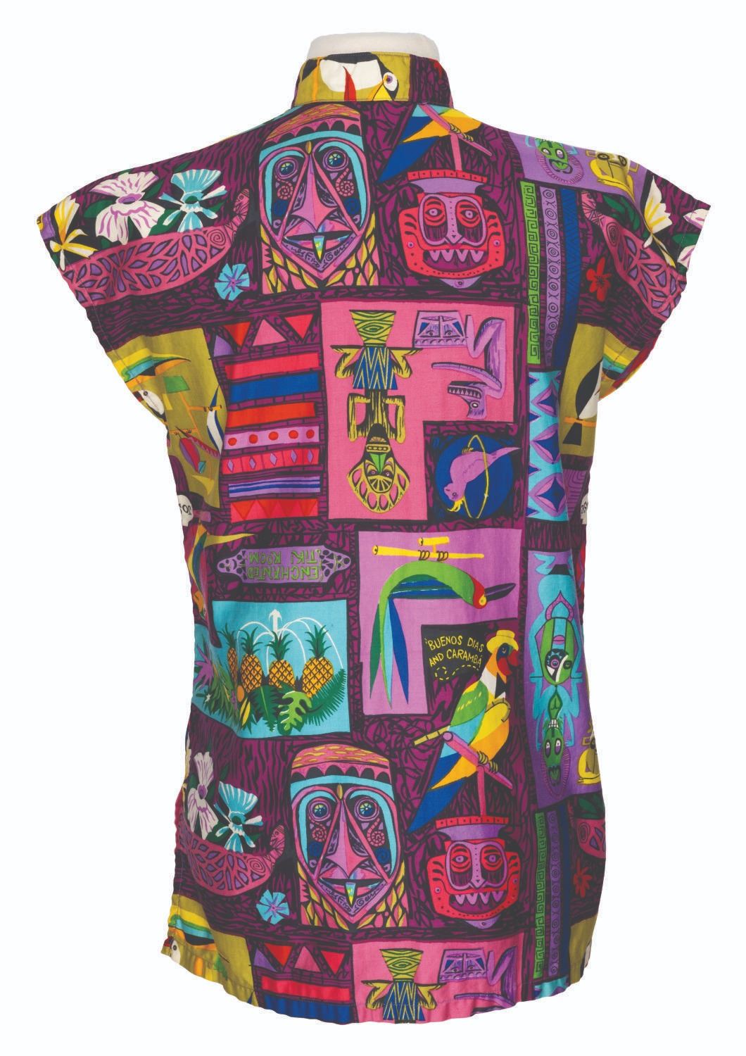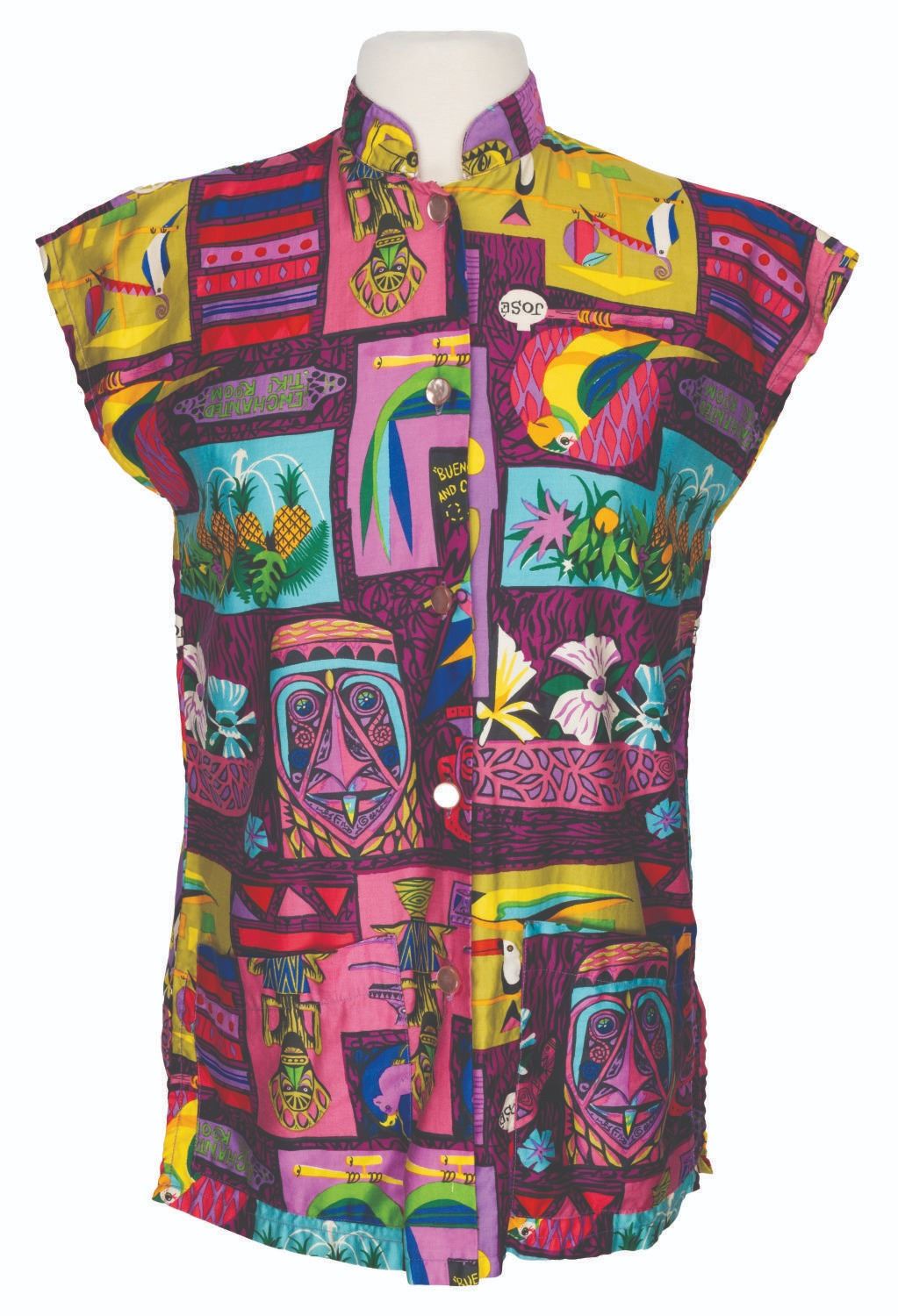 (Disneyland, 2003) A limited edition button-down shirt designed in the style of "Enchanted Tiki Room" Cast Member wardrobe. Created for the 40th Anniversary of the attraction, this shirt features Tiki Room imagery and was limited to an edition size of 500. The shirt is missing its size label but appears to be a size small, and is in very good condition exhibiting light wear.