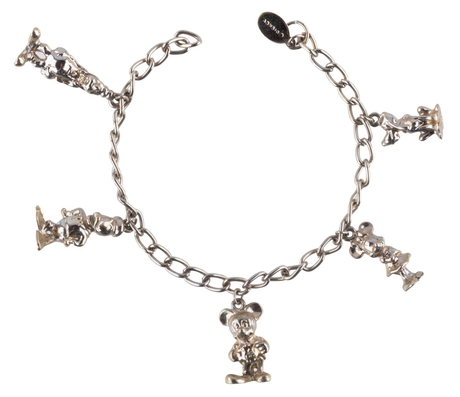 (Disneyland, 1970s-80s) A souvenir silver-toned charm bracelet featuring five charms of Mickey and Minnie Mouse, Donald Duck, Pluto, and Goofy. Measuring 6” in length with 0.5” to 1” charms, the bracelet is in fine condition.