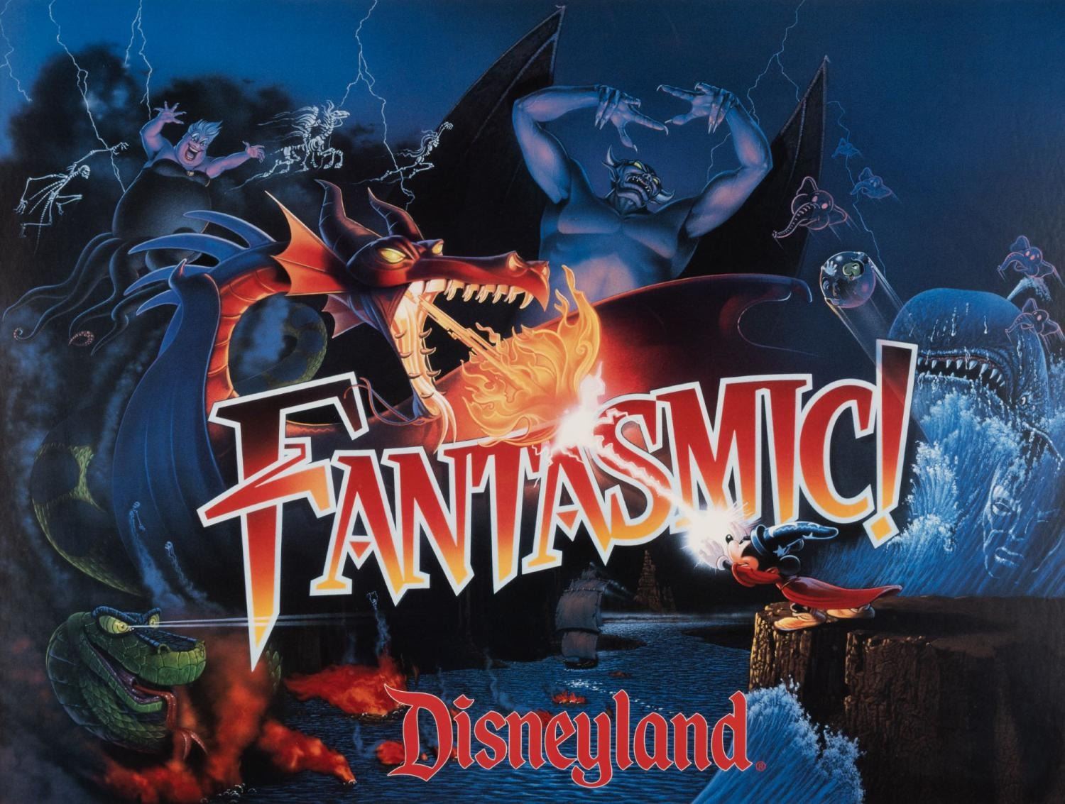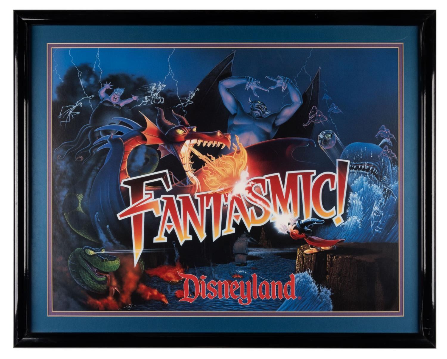 (Disneyland, 1992) An opening year poster for Fantasmic! Featuring Sorcerer Mickey battling Maleficent in dragon form, surrounded by Disney villains including Ursula, Chernabog, and Monstro. With a 16.75” x 22.5” image size in a 20” x 25.5” matte, the poster is in very good condition with light wear.