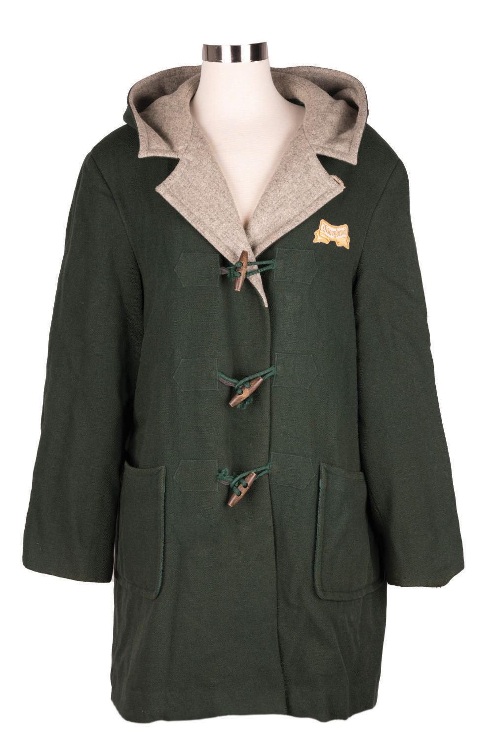 (Disneyland, 1990s-2000s) A heavy winter coat once worn by Cast Members in the Fantasyland area of at Disneyland. Measuring a size "XL," this coat is in very good condition, retaining wooden buttons and its Disneyland patch, with some pilling and wear to textile from Park use, handling, and age.