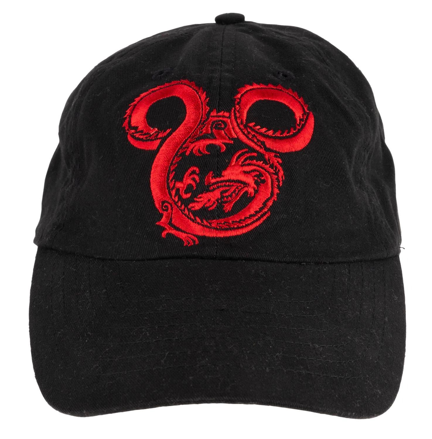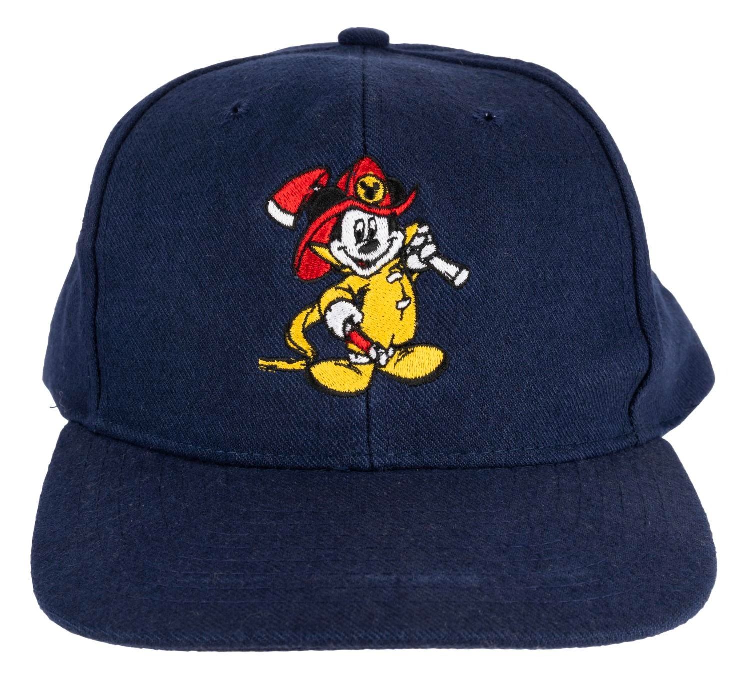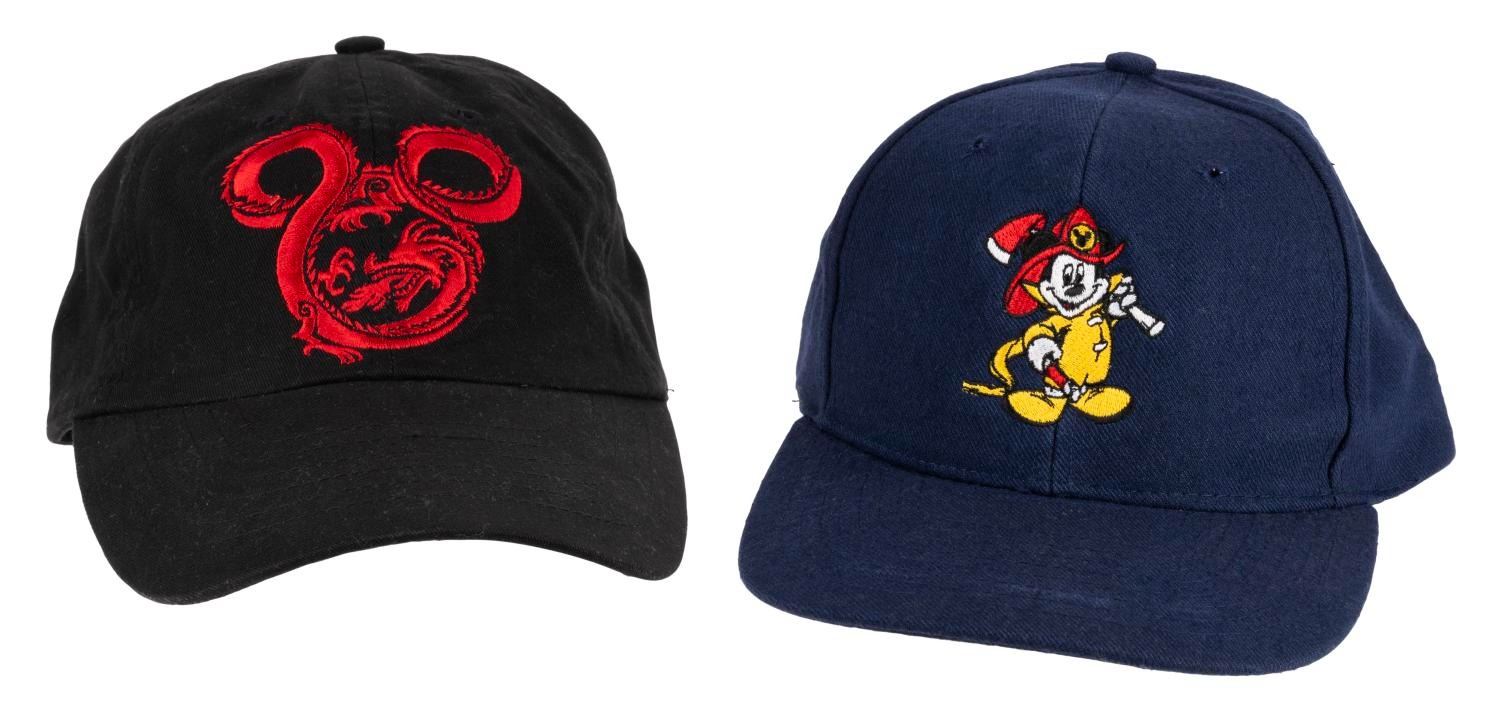 (Disneyland, 1990s) A pair of cast member Disneyland caps, one featuring an embroidered Mickey Mouse Fireman (only available to the Disneyland Fire Department) and the other with a Mushu Dragon (available for the opening of Hong Kong Disneyland). These adjustable hats are in very good condition exhibiting light wear.