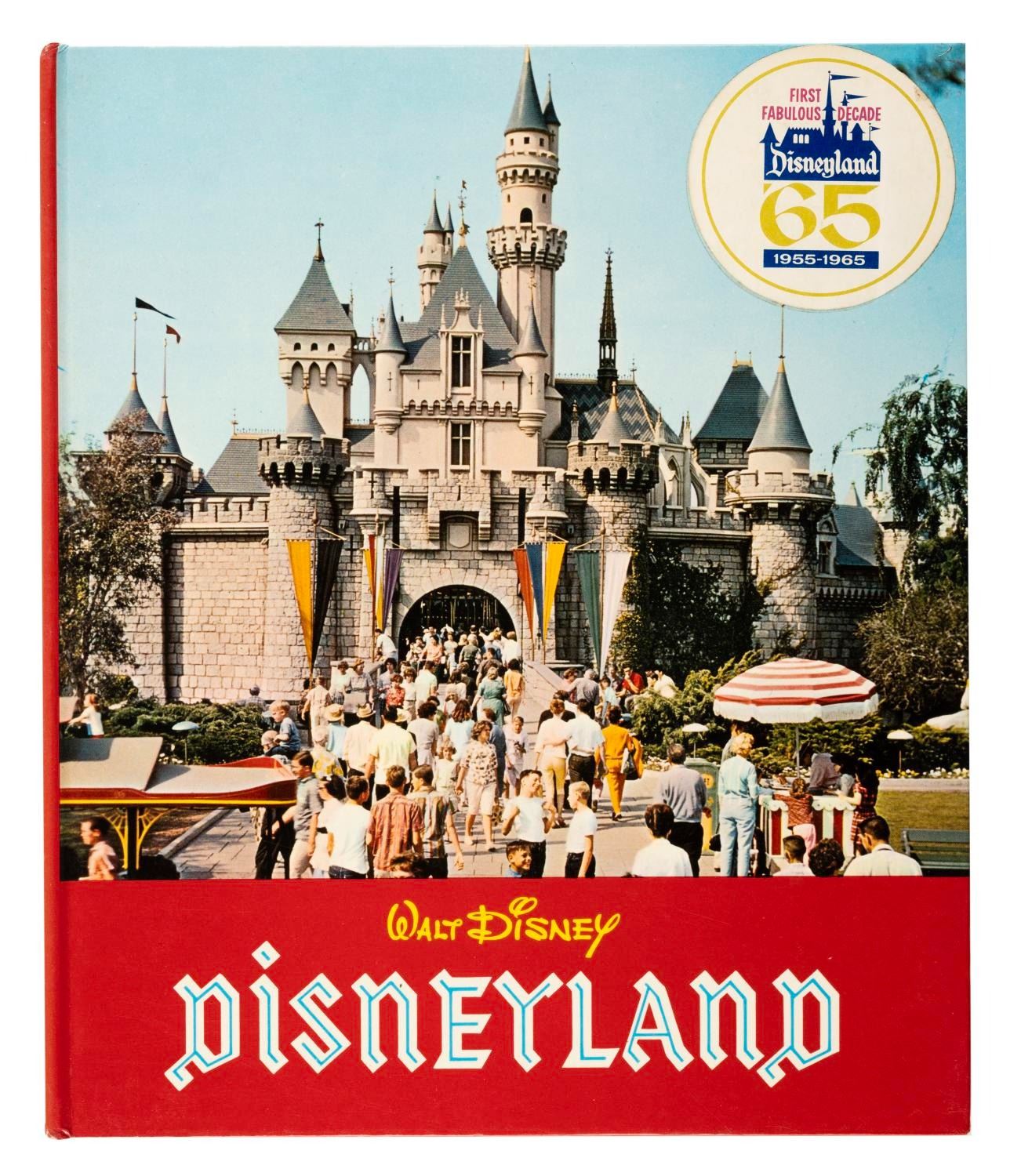 (Disneyland, 1964) A Disneyland souvenir hardcover book written by Marty Sklar featuring the story of the Park and rare color photos of its lands and attractions. Measuring 9.5" x 11", the book is in good condition with surface scratches and wear, including tape residue and tears on the inside covers.