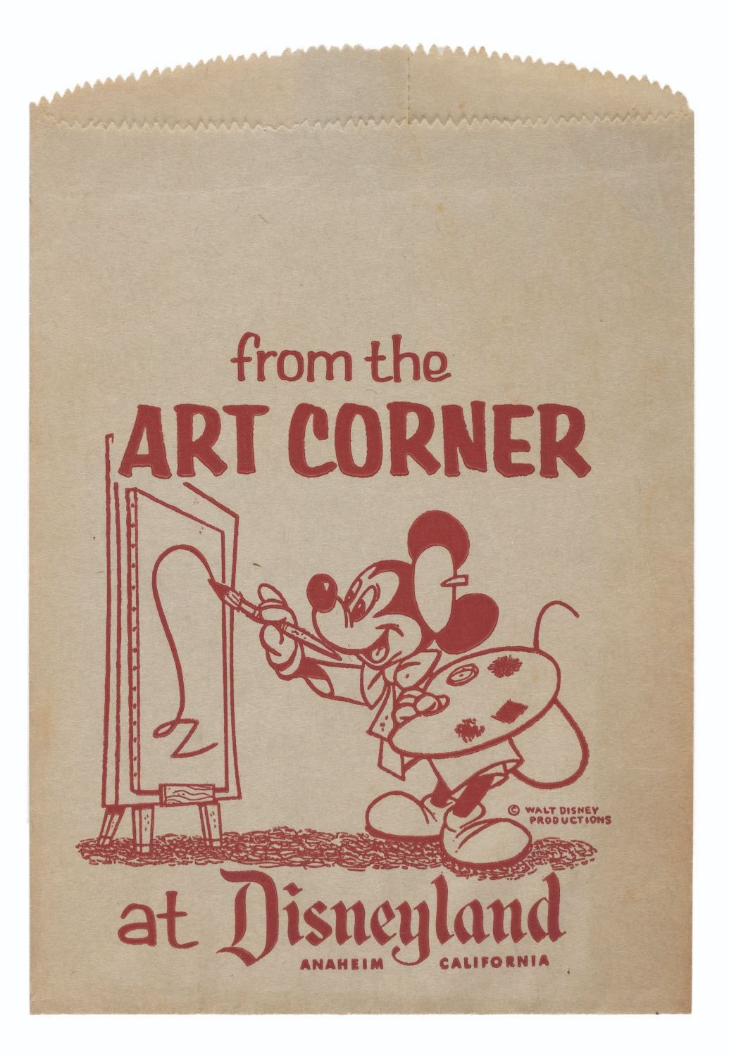 (Disneyland, 1960) A small souvenir bag from The Art Corner at Disneyland. Bags of this style were used to package merchandise purchased at both the Fantasyland and Tomorrowland Art Corner locations. Measuring 5.5"x8", the bag is in very good condition with faint yellowing, mild creasing, and minor edge wear.