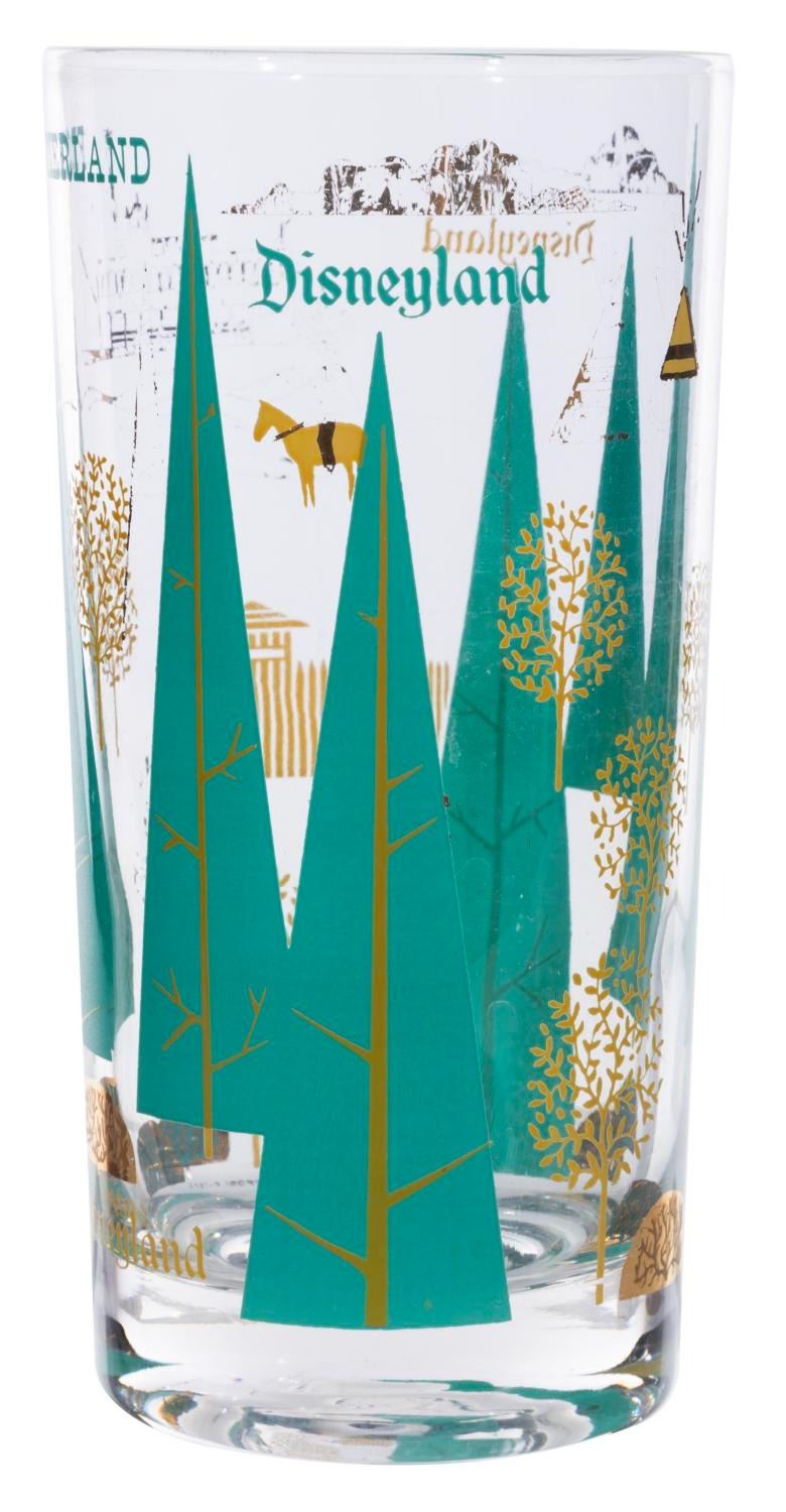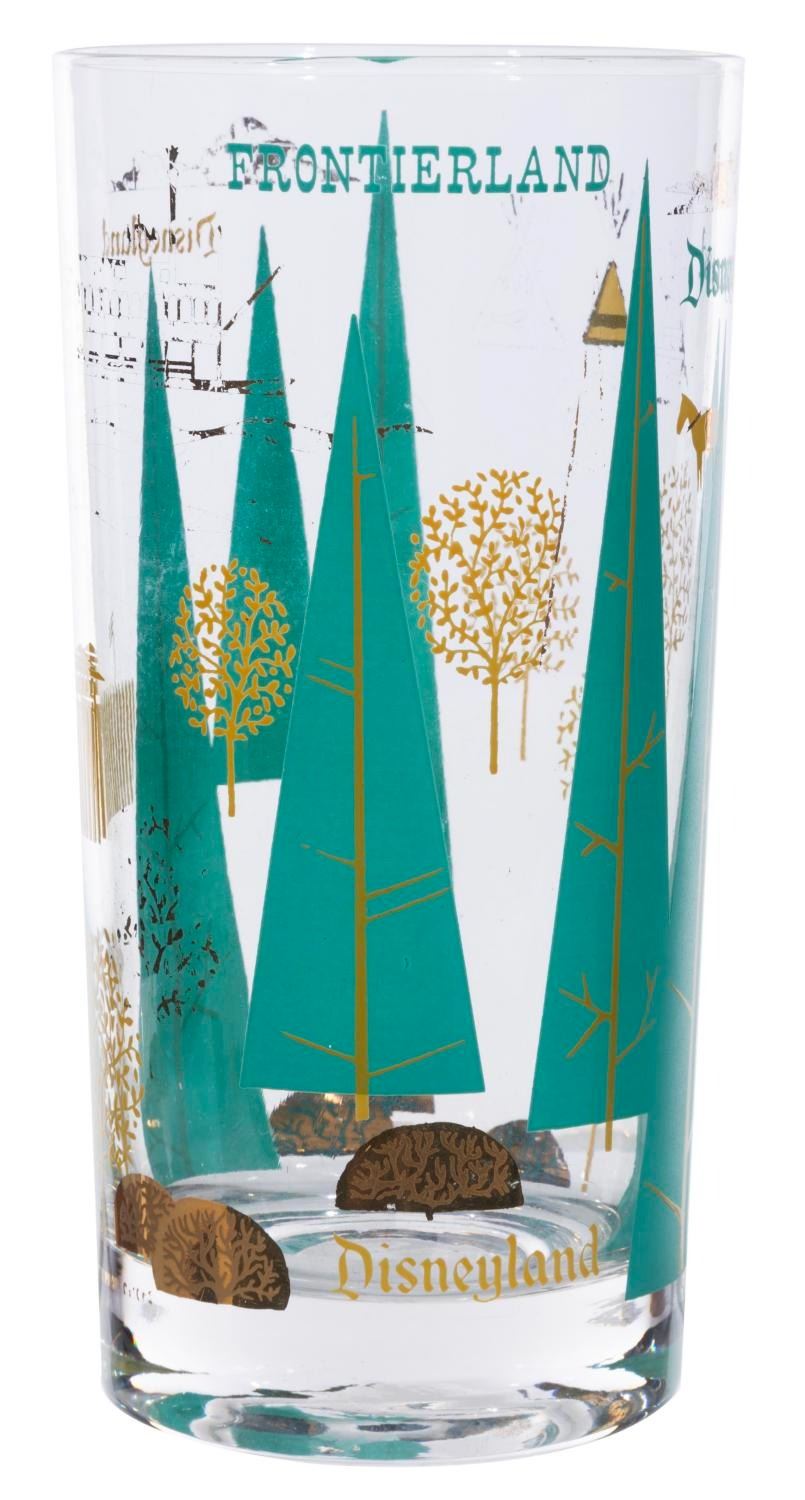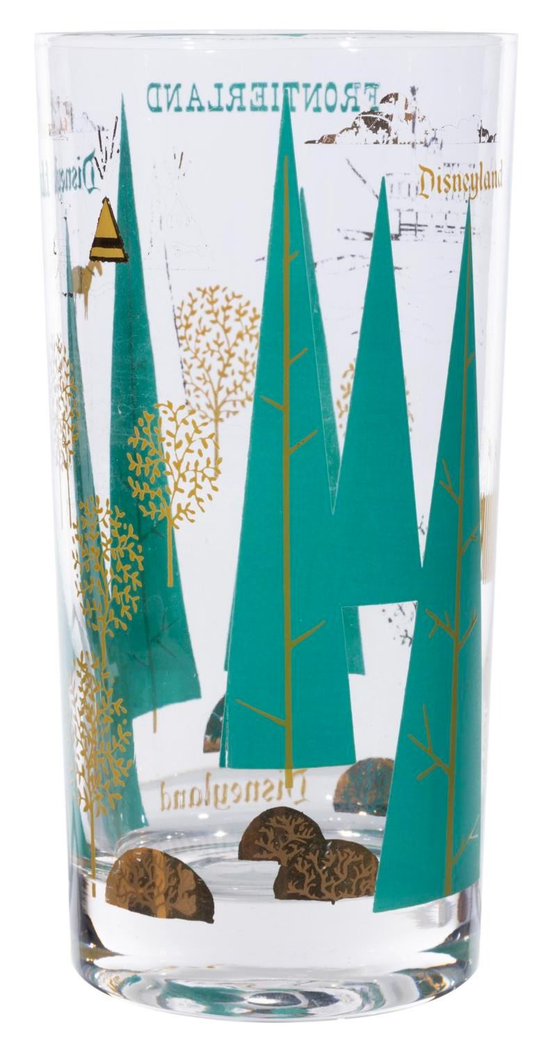 (Disneyland, 1960s) A Disneyland Frontierland drinking glass featuring the Mark Twain, Fort Wilderness, a tipi, and the tree-lined Rivers of America. Measuring 5.5" tall and 2.75" in diameter, the glass is in good condition with moderate paint loss of some details.