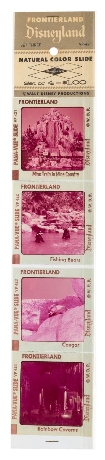 (Sawyer’s, 1970s-80s) A set of four Frontierland Pana-Vue slides in their original packaging. Included are slides of the Mine Train, Fishing Bears, a cougar, and the Rainbow Caverns. Measuring 2" x 2" each, the slides are in very good condition with typical color fading from age.