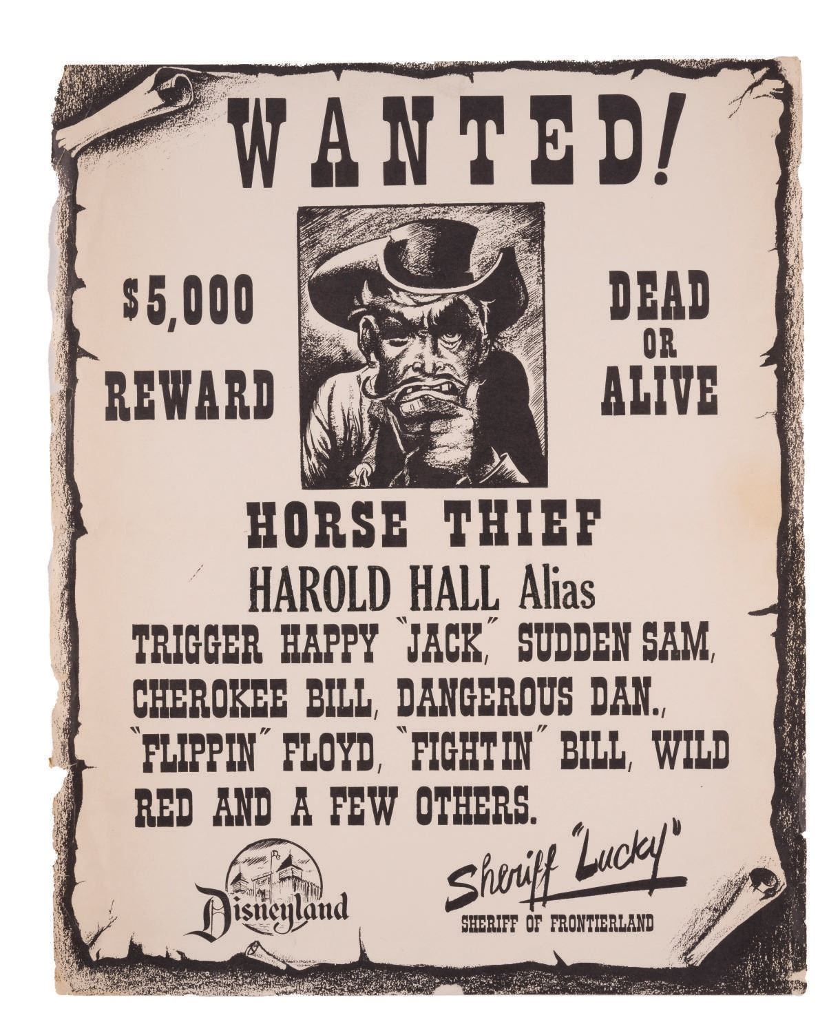 (Disneyland, 1950s-60s) A Frontierland Wanted Poster from Disneyland. Guests could have their names added to posters sold through the Frontierland Print Shop and Old Time Print Shop on Main Street. Measuring 13.25"x16.5", the poster is in good condition overall with horizontal crease and wear to edges and corners throughout from handling and age.
