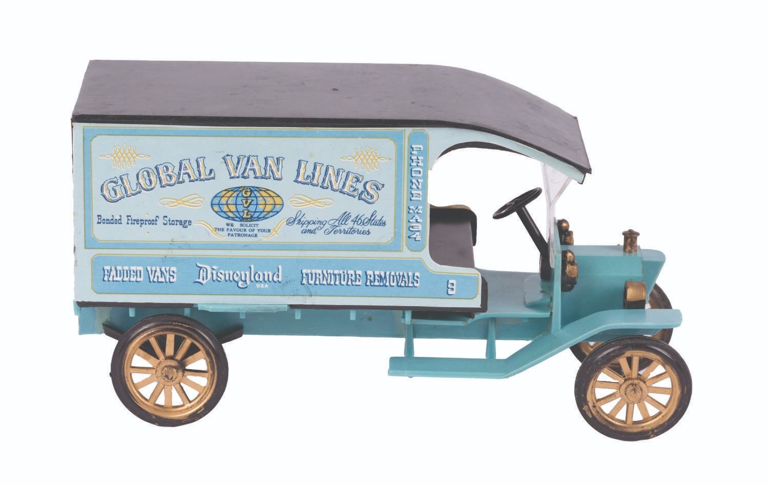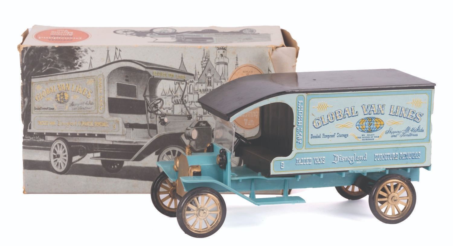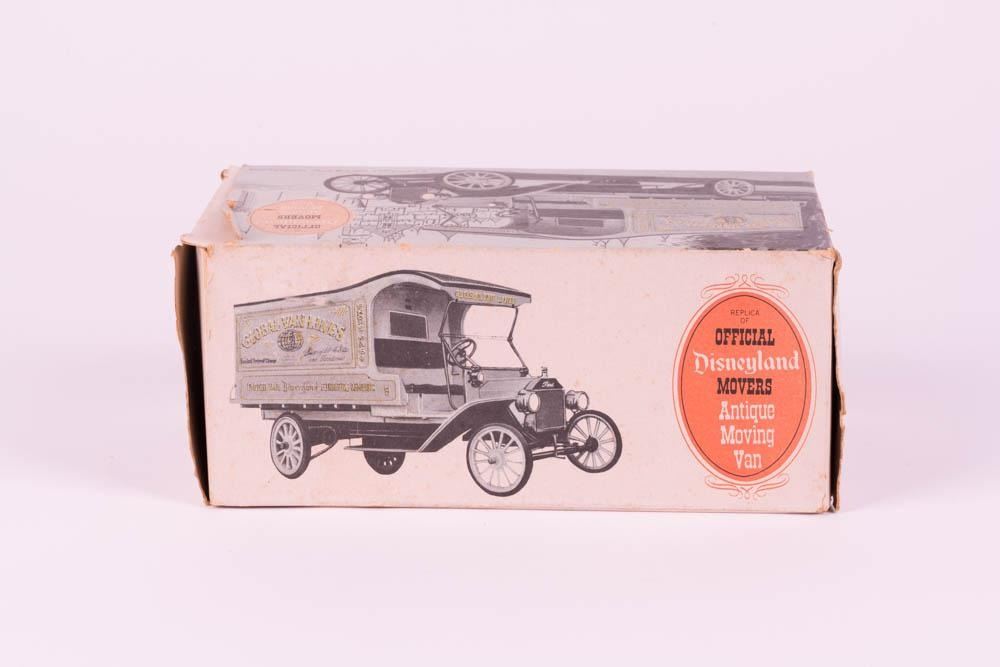 (Disneyland, 1960s) A toy replica of the Global Van Lines antique moving van. Constructed of plastic with printed color labels, a transparent plastic windscreen, and rolling plastic wheels, this miniaturized version of the iconic Main Street mainstay includes the original cardboard box packaging. Measuring 7" x 2" and 3.75", the truck is in very good condition with minor wear to paint and plastic from handling and age, while the 7.25” x 4.25” x 3.25” box is in good condition with spots of discoloration, tears, and wear throughout.