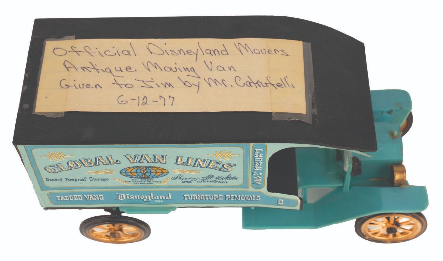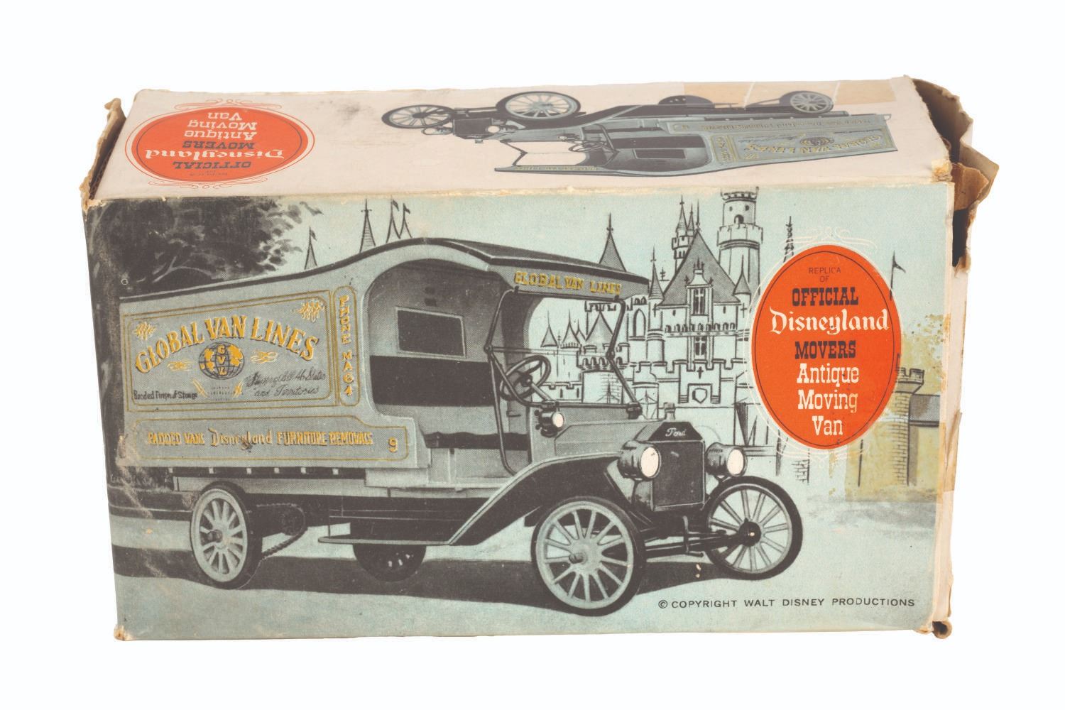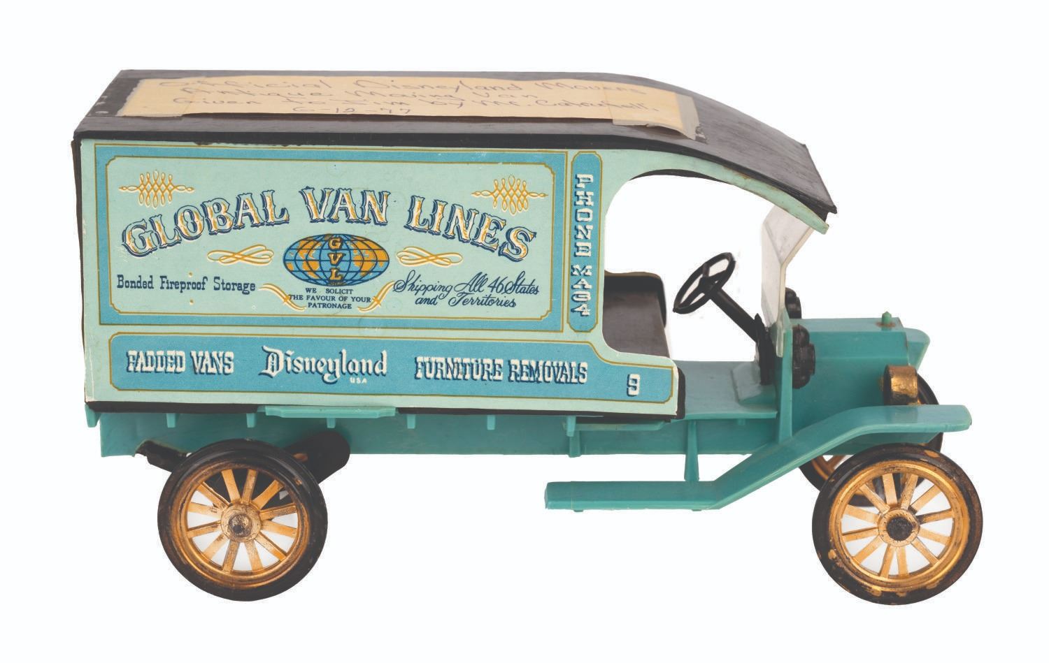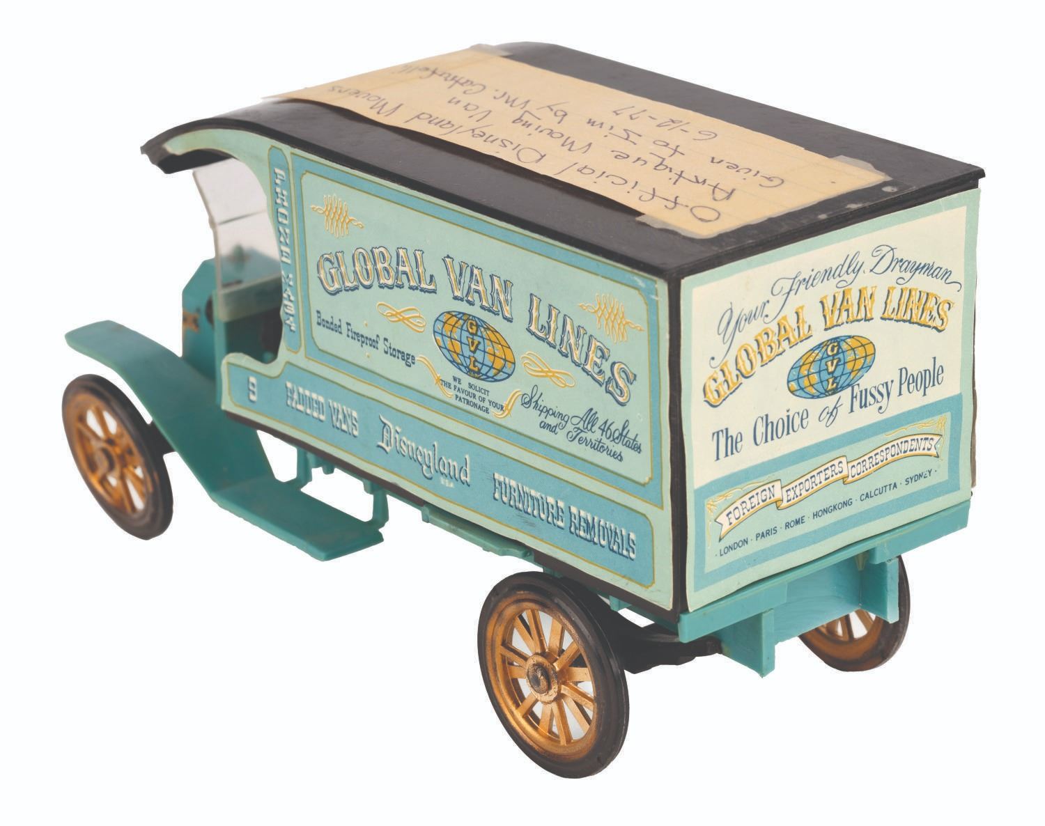(Disneyland, 1960s) A toy replica of the Global Van Lines antique moving van. Constructed of plastic with printed color labels, a transparent plastic windscreen, and rolling plastic wheels, this miniaturized version of the iconic Main Street mainstay includes the original cardboard box packaging. Measuring 7" x 2" and 3.75" tall, the truck is in fair condition with a missing headlight, paint loss throughout, and peeling decals. The original box measures 7.25"x 3.25" and 4" tall and is in fair condition with moderate handling wear, an obvious repair job with packing tape, and a name written in permanent marker on two sides.