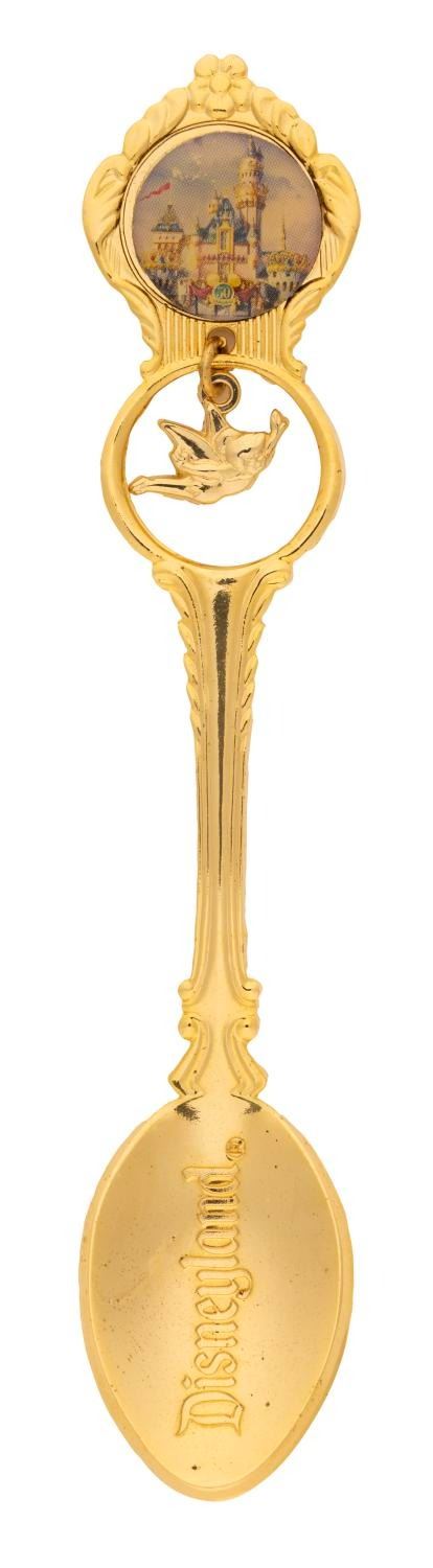 (Disneyland, 2005) A gold-plated spoon featuring a cloisonne Sleeping Beauty Castle with a Tinker Bell charm. Measuring 4.5" long, this spoon is in very good condition with minor wear.