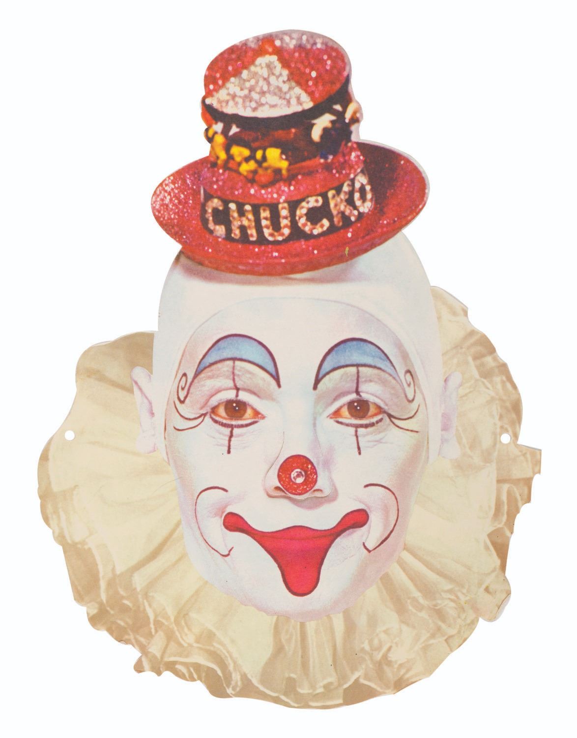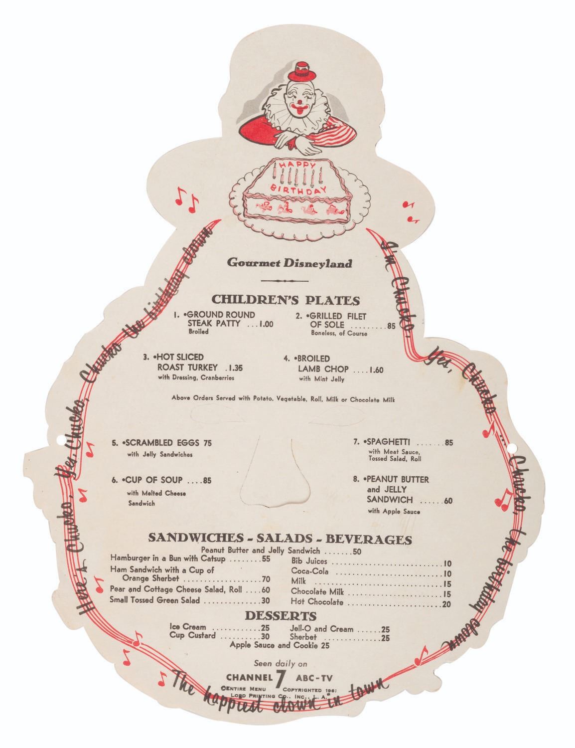 (Disneyland Hotel, 1961) A children's menu from the Gourmet Restaurants at the Disneyland Hotel. The menu highlights children's plates with imagery inspired by local Los Angeles area entertainer Chucko the Birthday Clown. Measuring 11.5” x 8.5”, the menu is in very good condition, exhibiting the slightest wear.