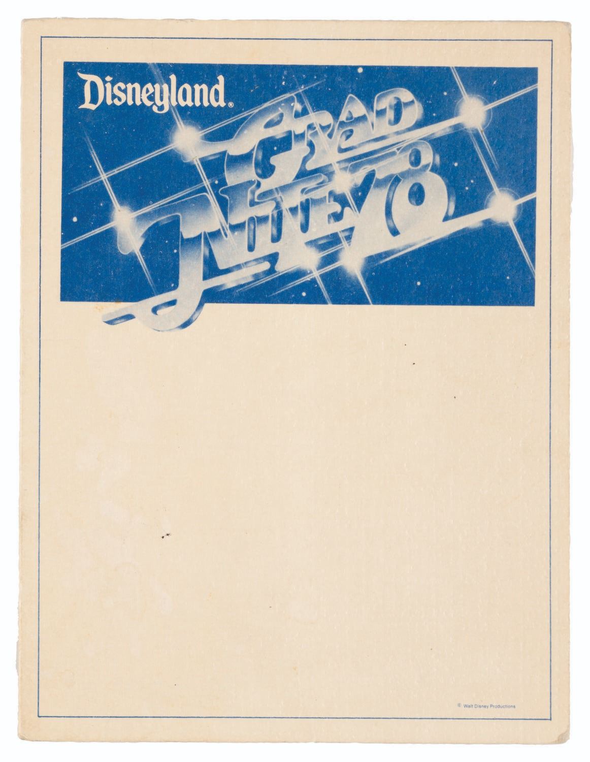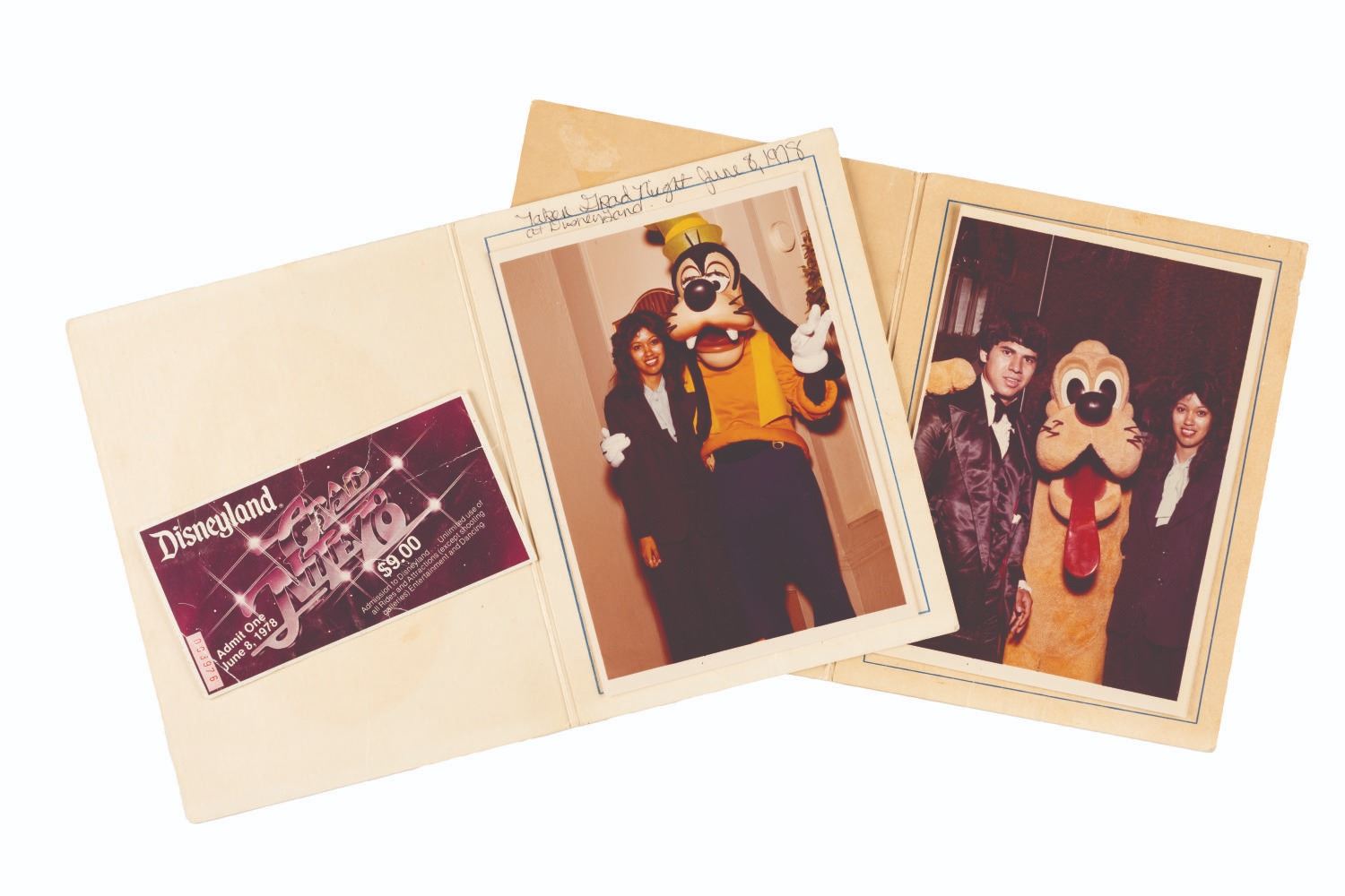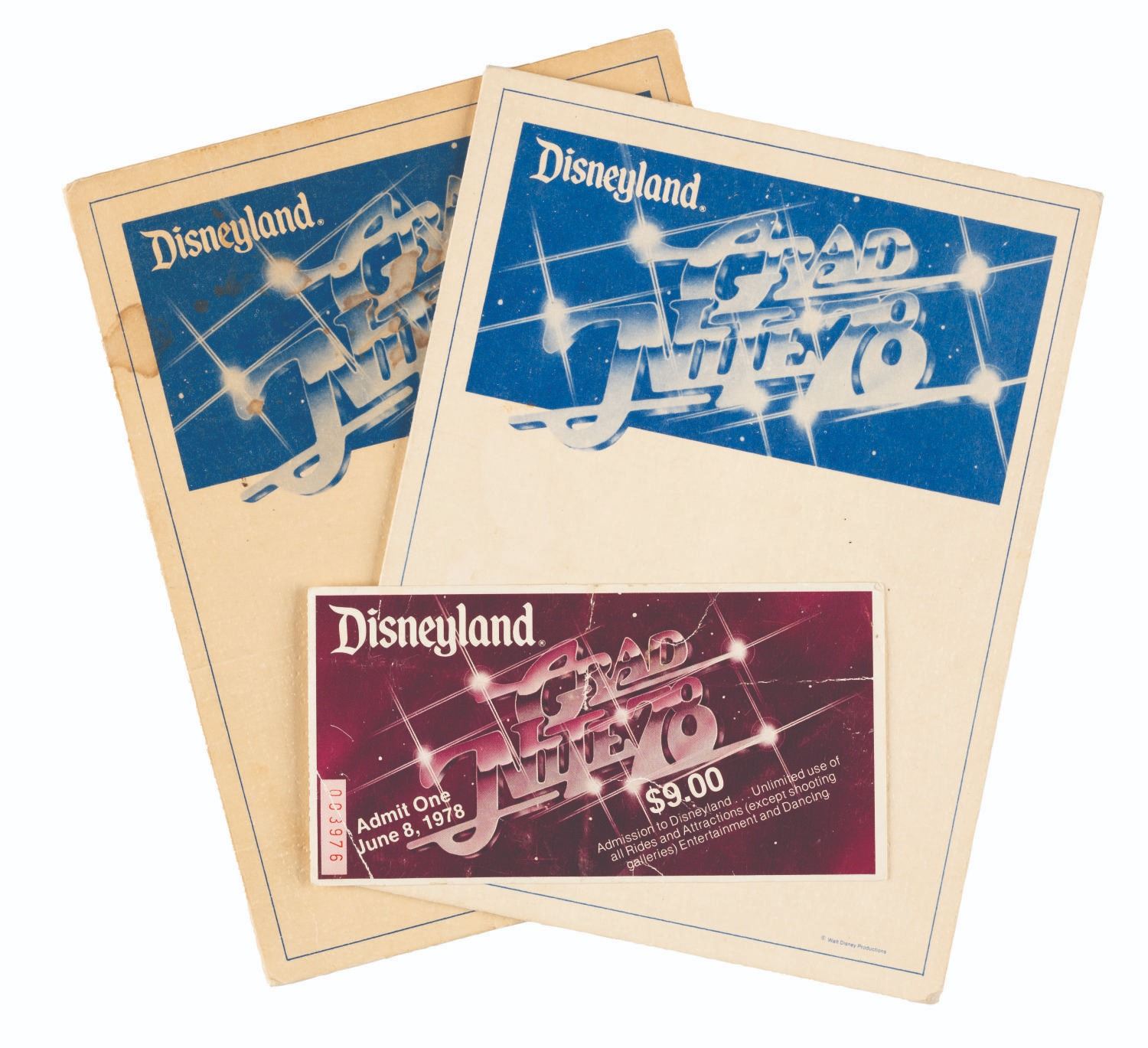 (Disneyland, 1978) A Disneyland Grad Night 1978 admission ticket and pair of souvenir photos of high school students posing with Pluto and Goofy. The annual all-night party for graduating high school seniors began as an alternative to unsupervised celebrations. The 3" x 5.5" ticket displays in good condition with heavy edge wear, creasing, and light stains on the reverse. Measuring 5" x 7" with 6" x 8" cardboard holders, the photos are in fair condition with edge wear, stains, discoloration, and one with handwriting in graphite and ink on the reverse.