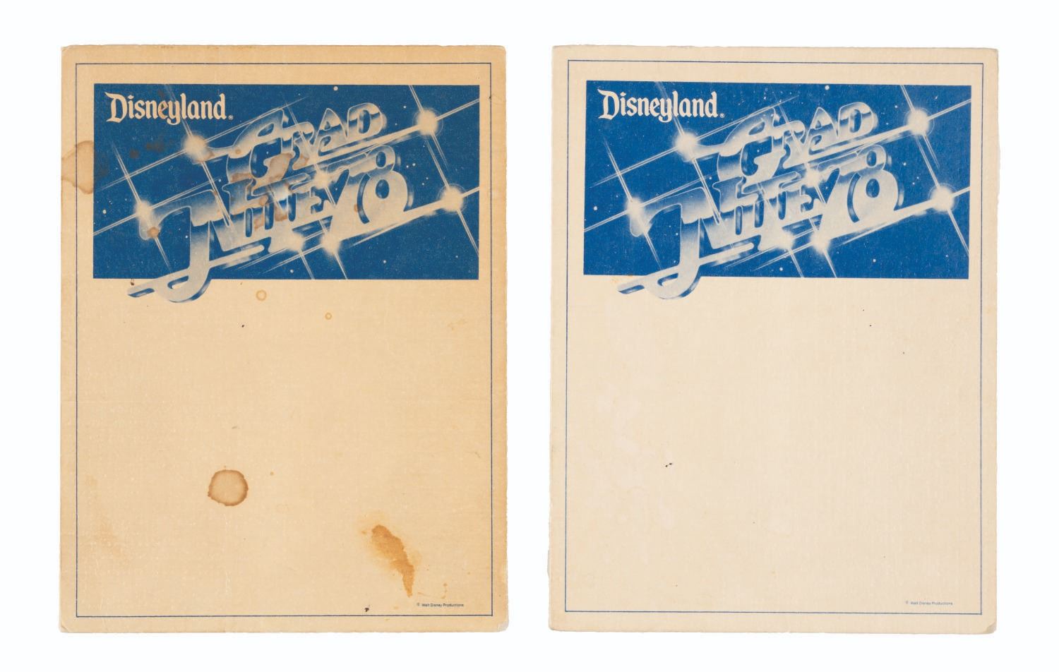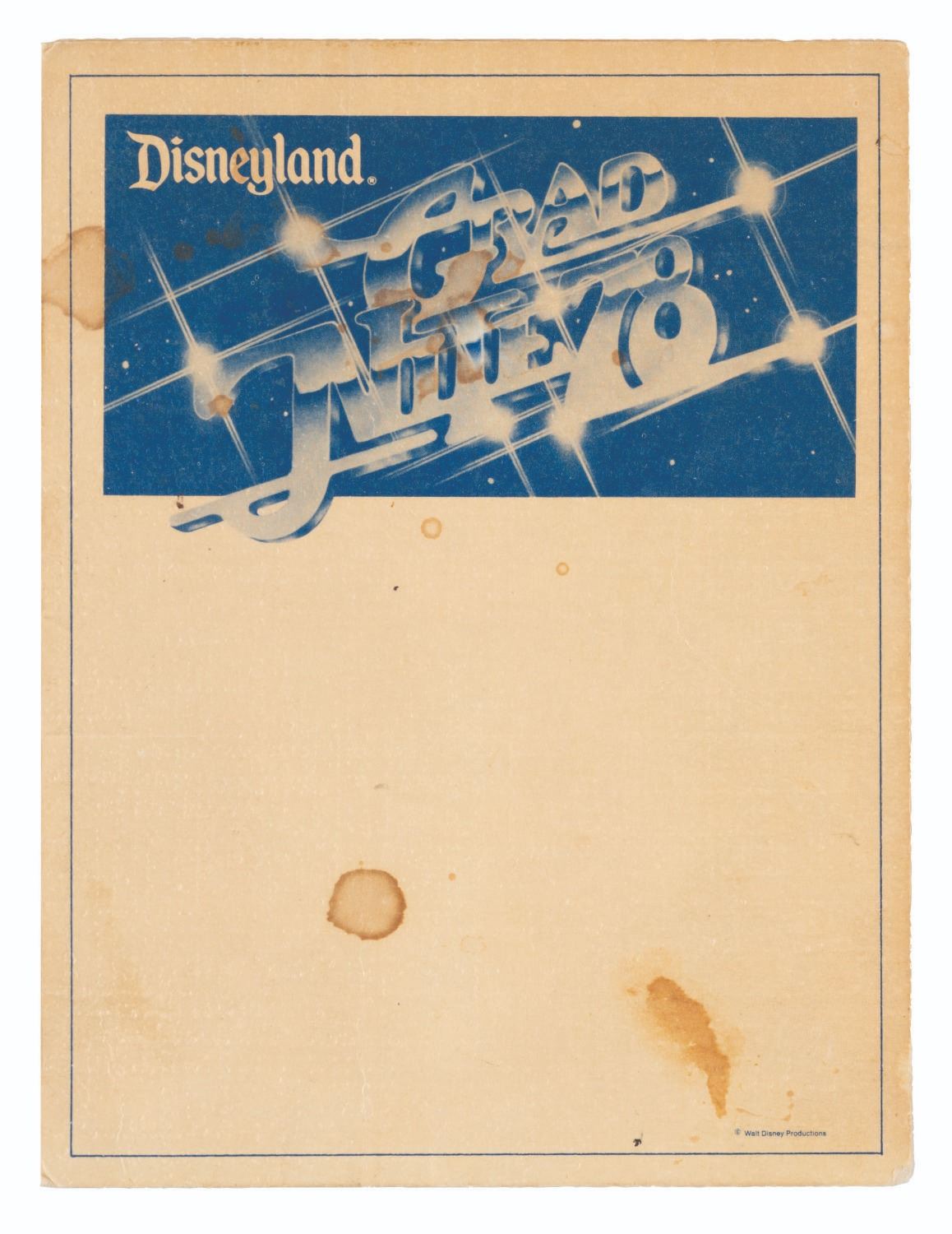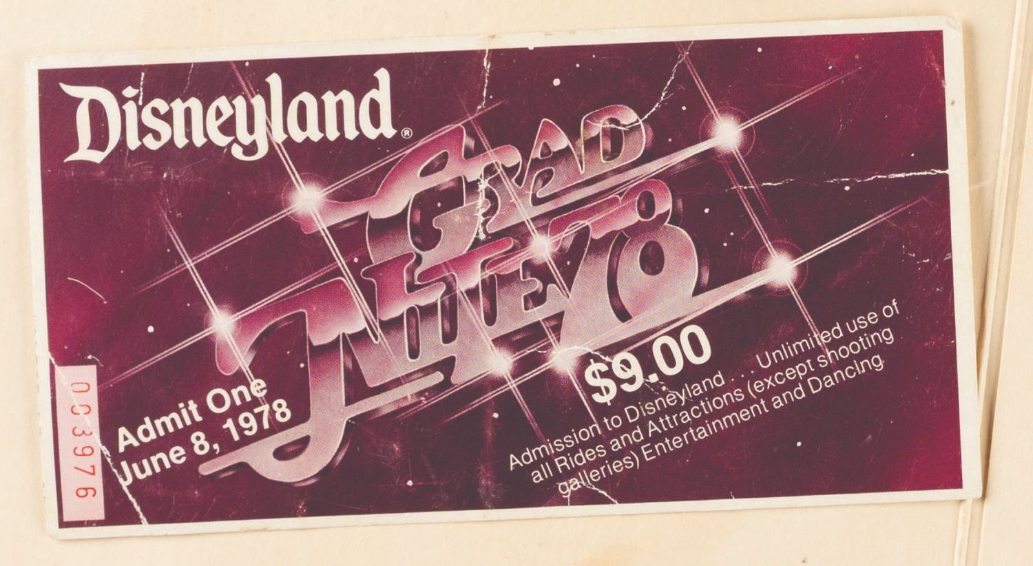 (Disneyland, 1978) A Disneyland Grad Night 1978 admission ticket and pair of souvenir photos of high school students posing with Pluto and Goofy. The annual all-night party for graduating high school seniors began as an alternative to unsupervised celebrations. The 3" x 5.5" ticket displays in good condition with heavy edge wear, creasing, and light stains on the reverse. Measuring 5" x 7" with 6" x 8" cardboard holders, the photos are in fair condition with edge wear, stains, discoloration, and one with handwriting in graphite and ink on the reverse.