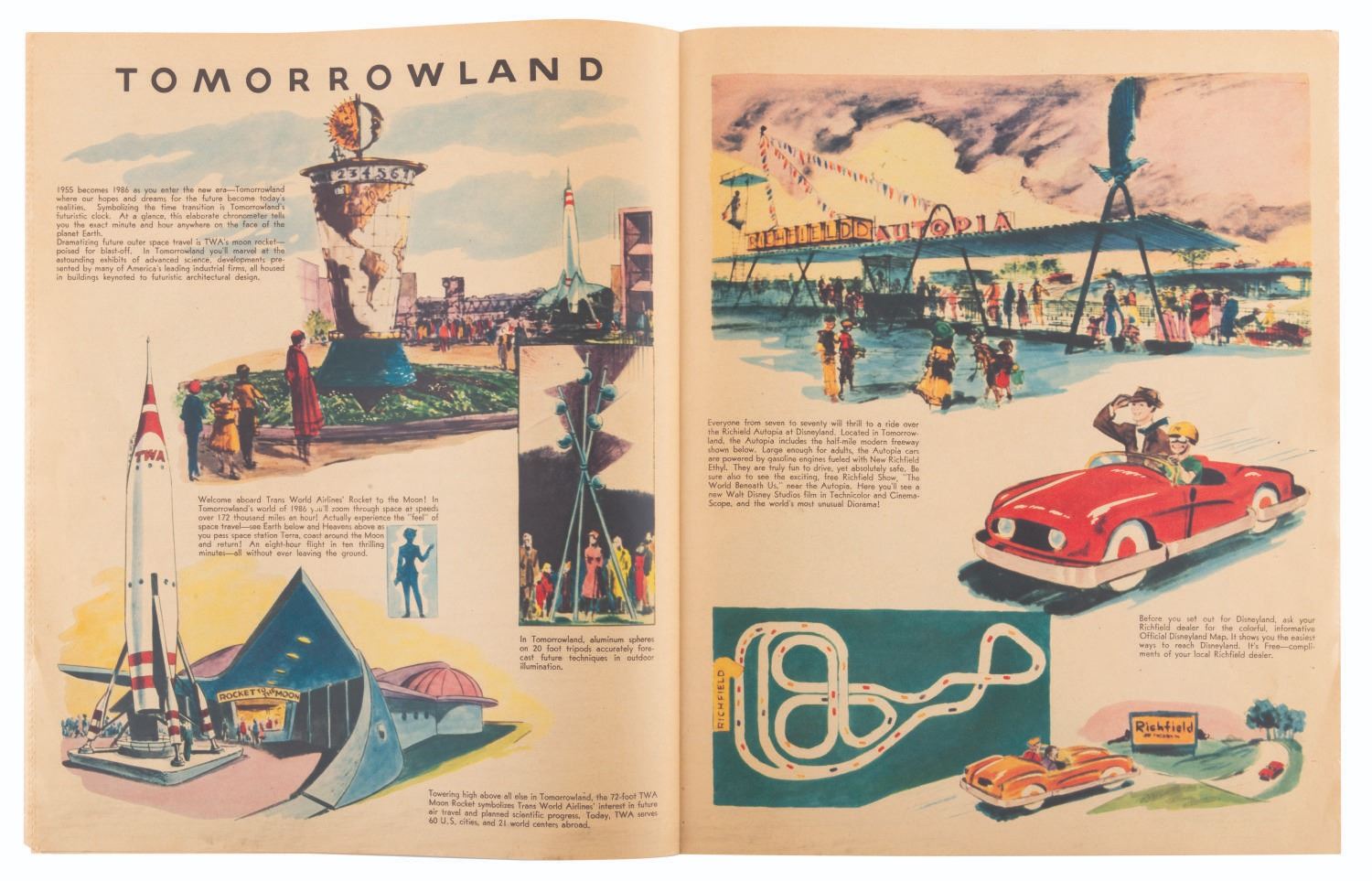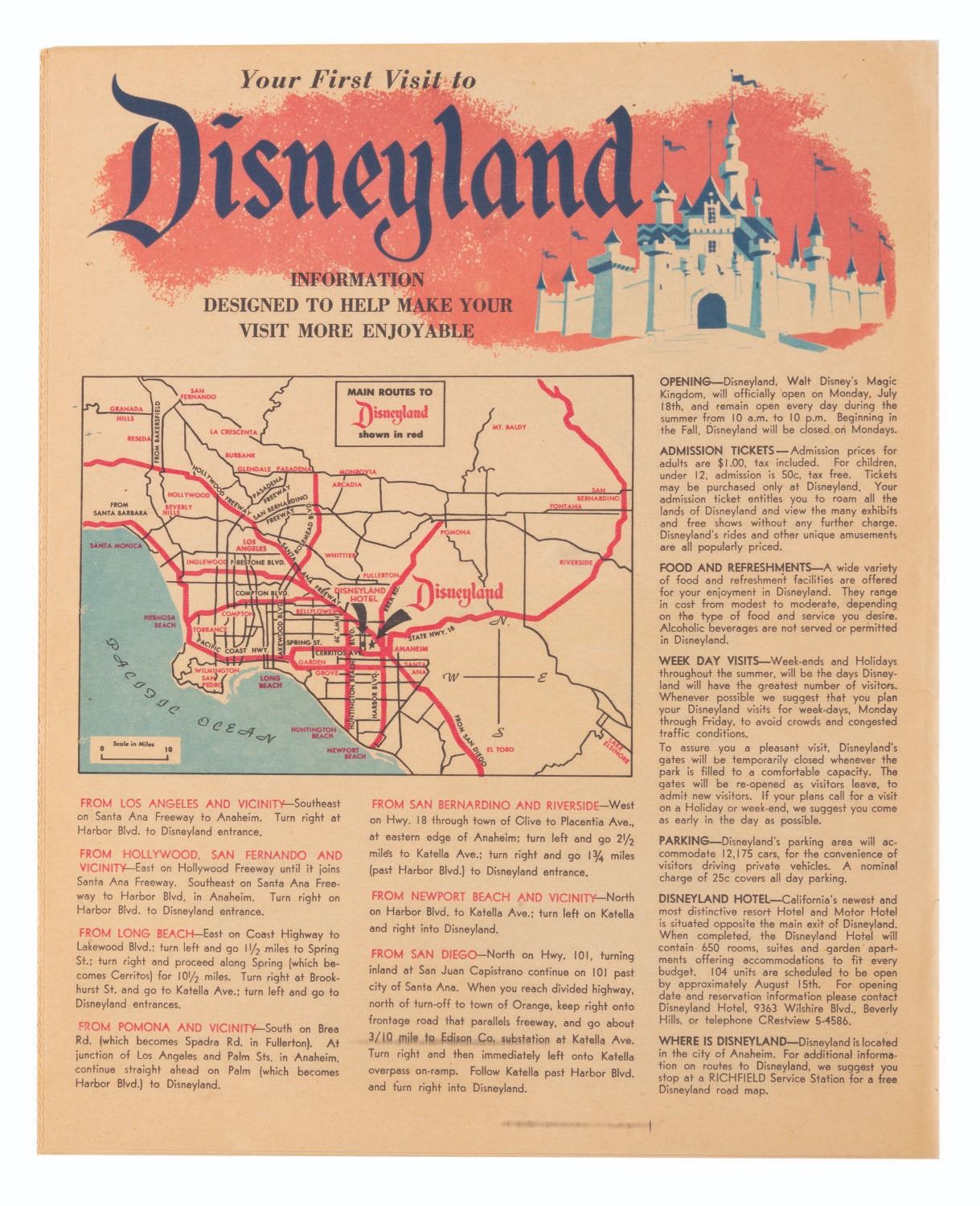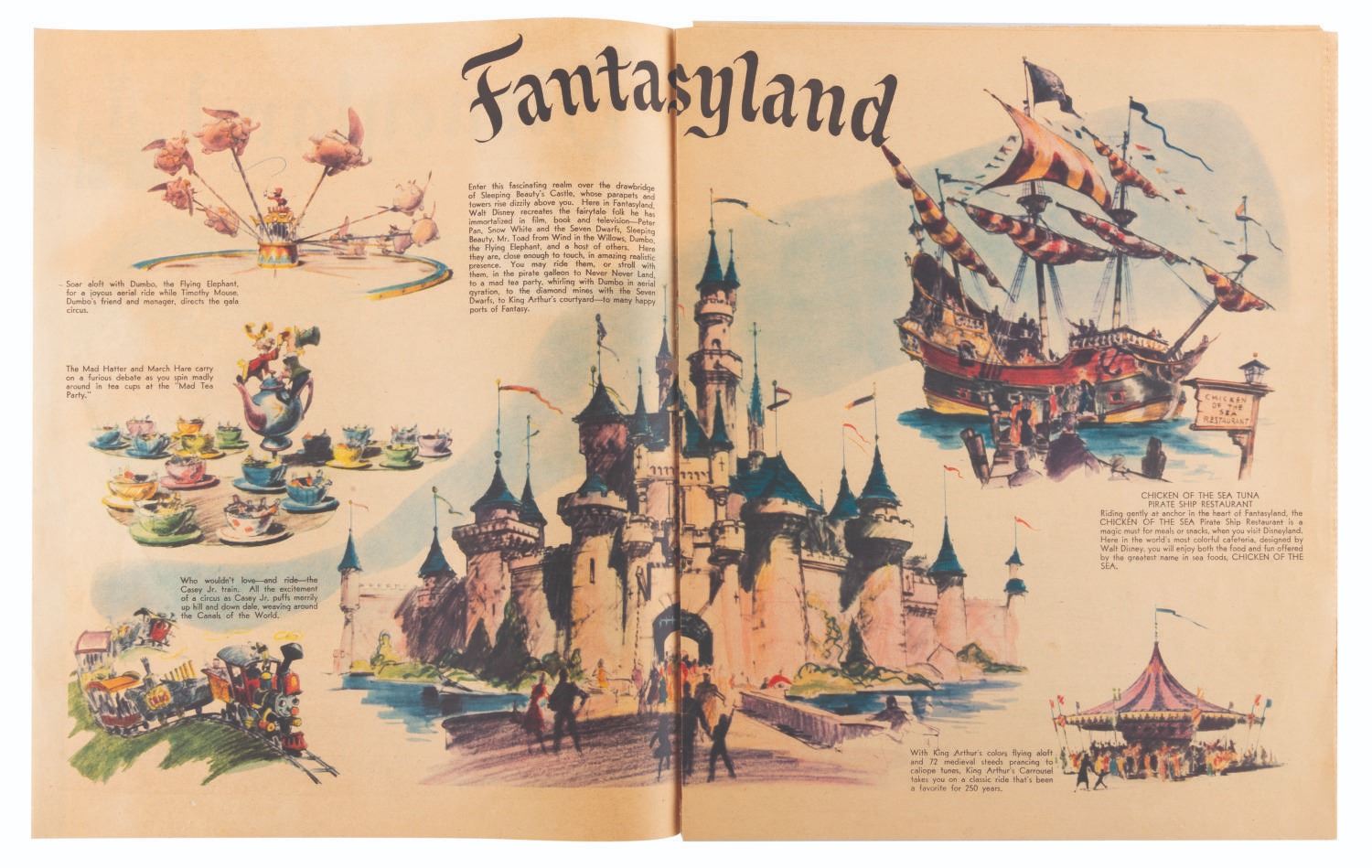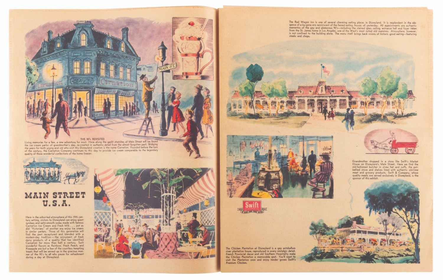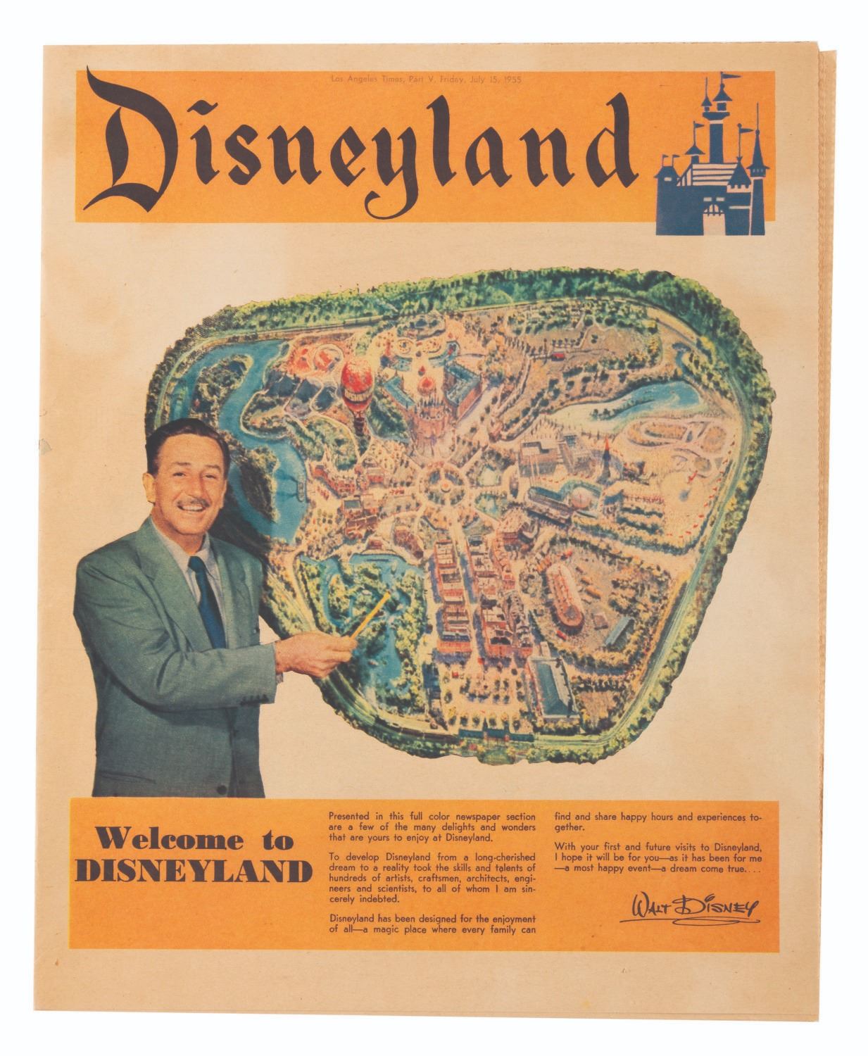 (Disneyland, 1955) A Southern California newspaper supplement dated July 15, 1955, promoting the opening of Disneyland on July 17, 1955. The 20-page supplement includes directions to the Park, an overview of each themed land, admission prices, and food and lodging options. Measuring 10.75" x 13.25", the supplement is in very good condition with a spot of paper loss on the spine and slightly uneven discoloration to the cover.