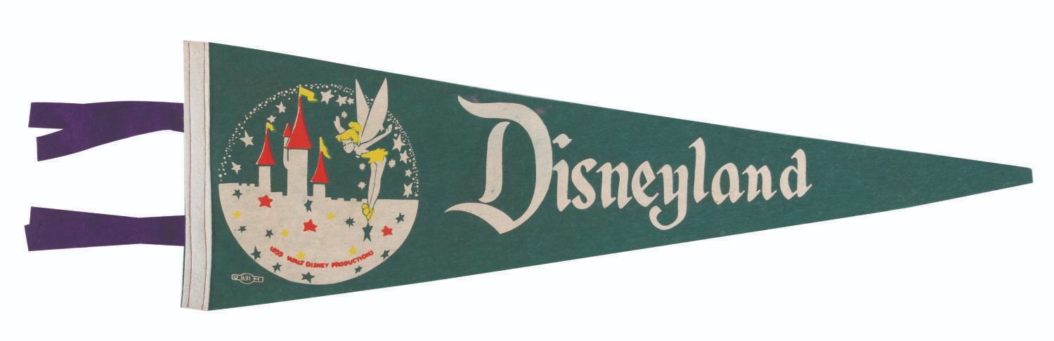 (Disneyland, 1955) A charming early Disneyland souvenir green pennant. This green felt pennant features screen printed graphics of the classic Disneyland text logo in white and a large image of Tinker Bell flying over Sleeping Beauty Castle. Measuring 26.5" long, the pennant is in very good condition with softening from age, spots of discoloration from exposure, a few minor creases to streamers, and surface wear.