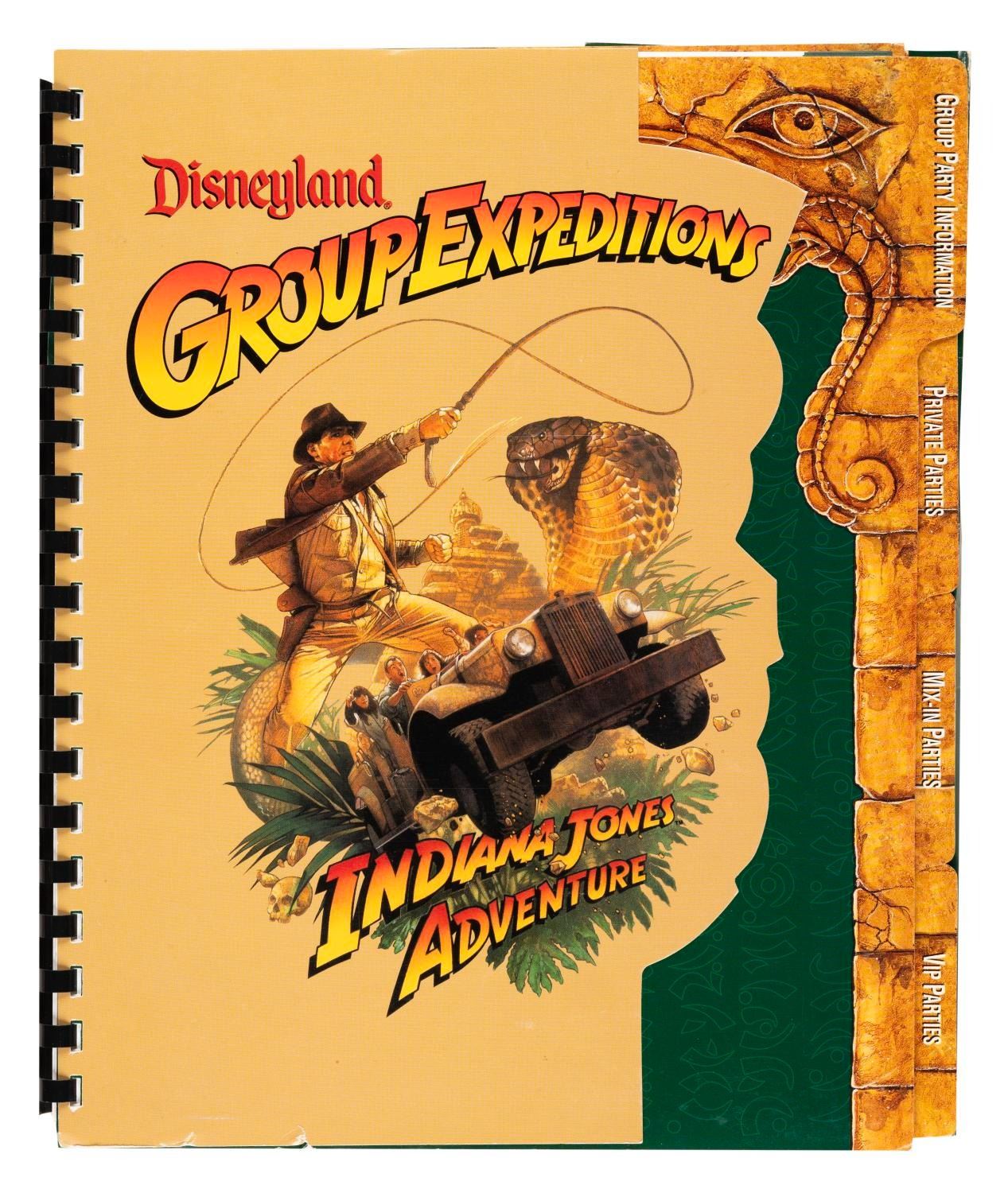 (Disneyland, 1995) A Disneyland Group Expeditions guide themed to the newly-opened Indiana Jones Adventure. Measuring 9.5" x 11.25", the spiral-bound guide is in good condition with scratches, creases, and wear from use.