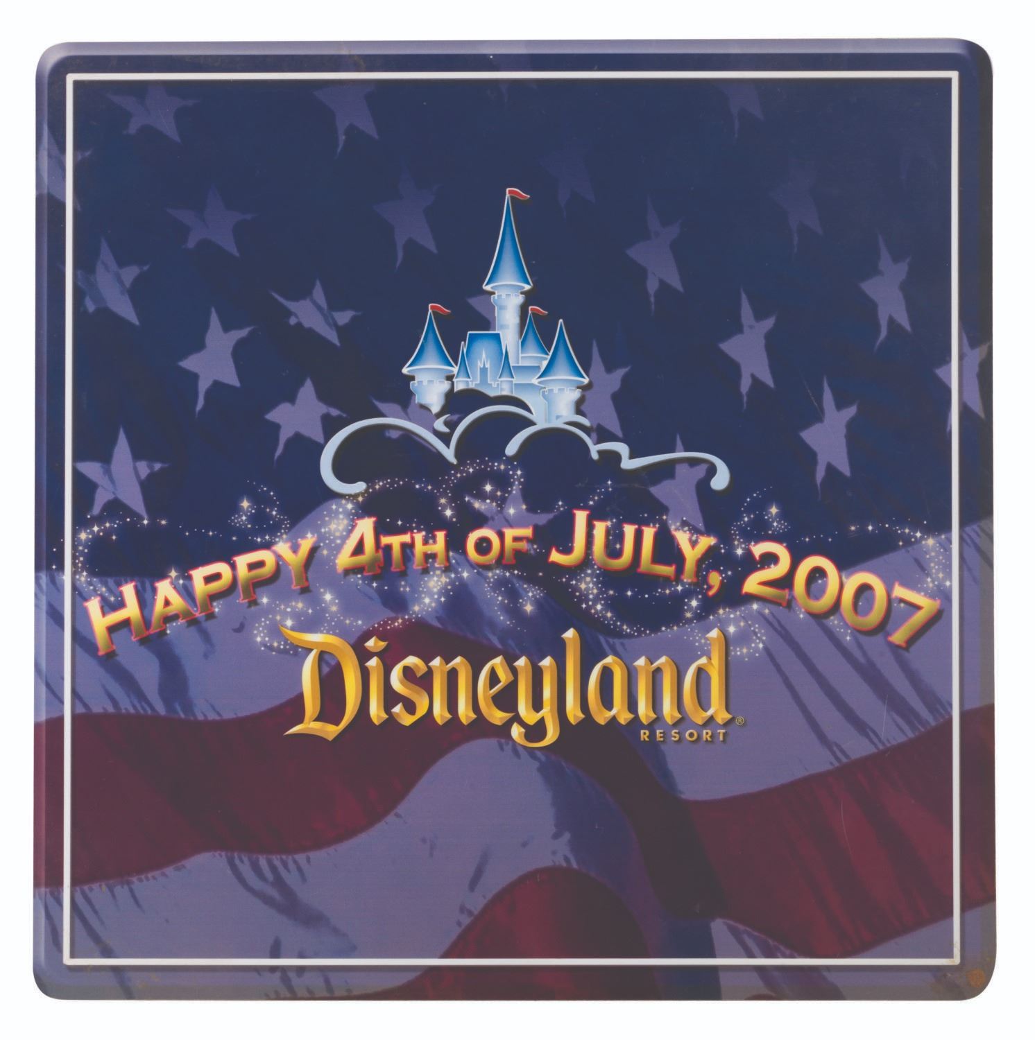 (Disneyland, 2007) A sign displayed at Disneyland during the Park’s 4th of July Independence Day celebration. Measuring 18” x 18”, the sign is in good, Park-used condition with light scratches, scuffs, edge wear, and smudges.