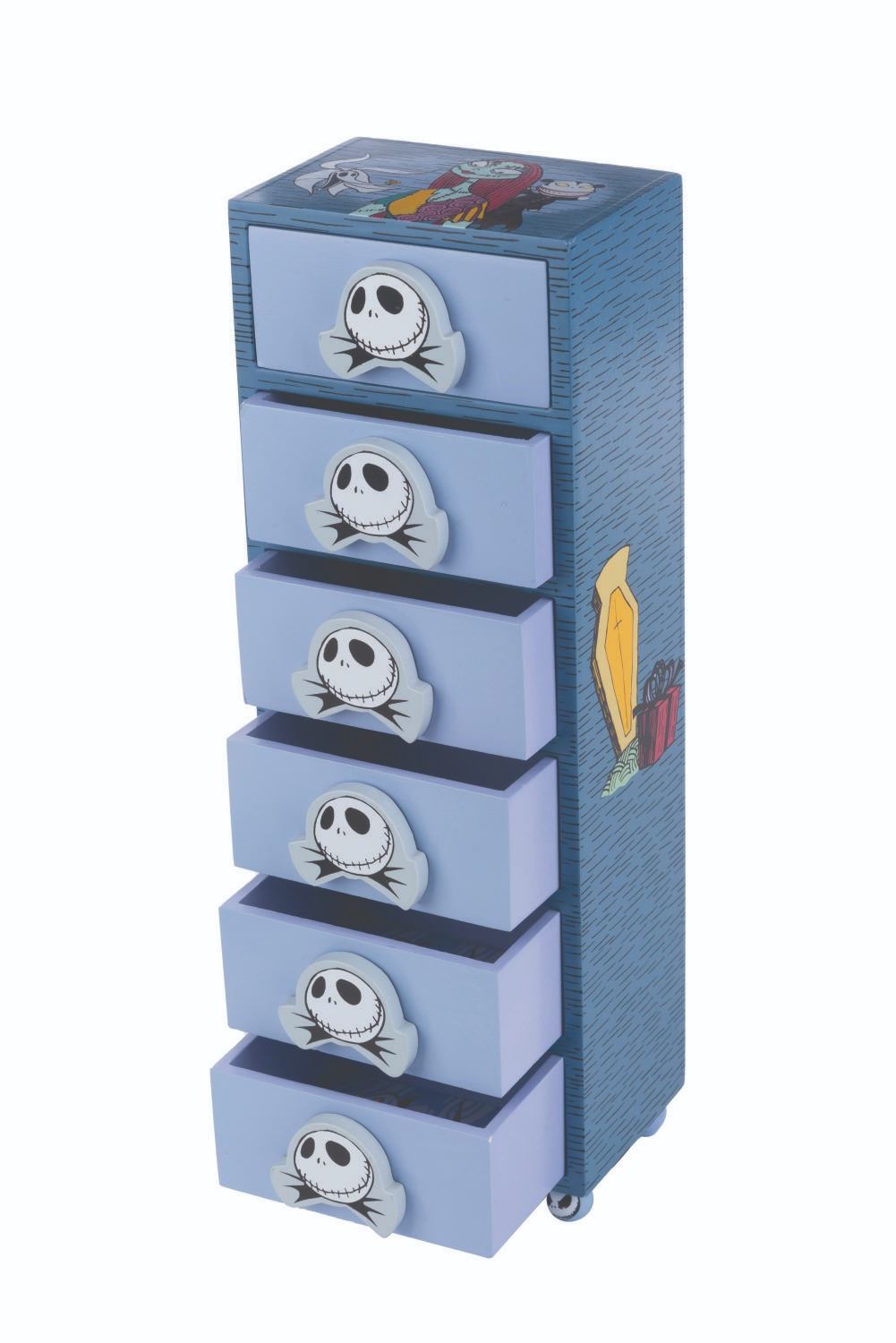 (Disneyland, 2004) A Disneyland Haunted Mansion Holiday Jewelry Box. The miniature jewelry box chest has (5) drawers and a motif featuring Jack, Sally, and the characters from Tim Burton’s The Nightmare Before Christmas. Measuring 12” tall and 4”x2.75”, the piece is in fine condition.