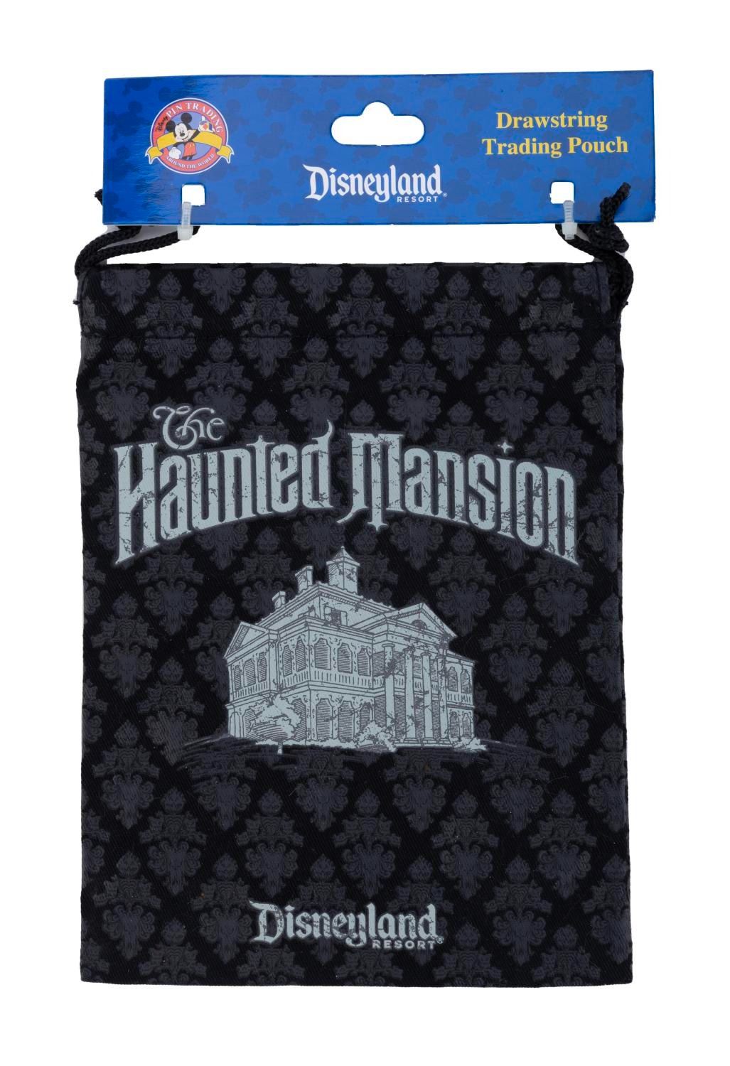 (Disneyland, 2000s) A Haunted Mansion Drawstring Pin Trading Pouch featuring the Hitchhiking Ghosts on one side and the Mansion on the reverse. Measuring 5.75" x 8", the pouch is in fine condition with the original tag attached.
