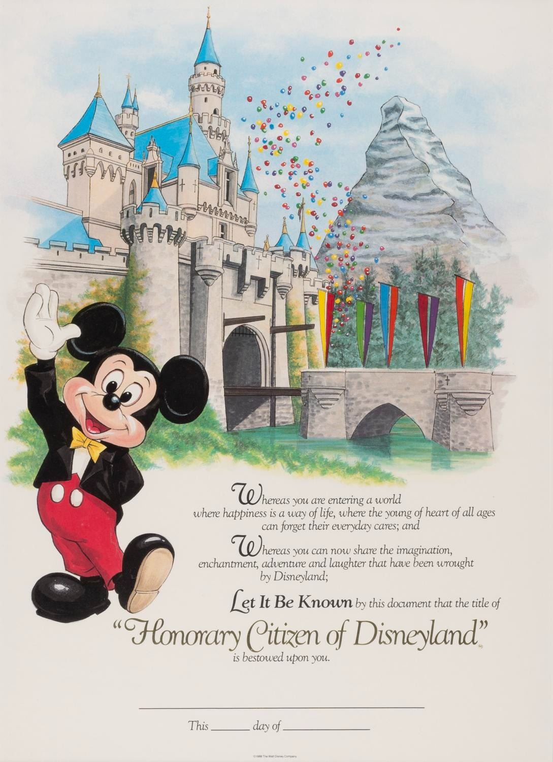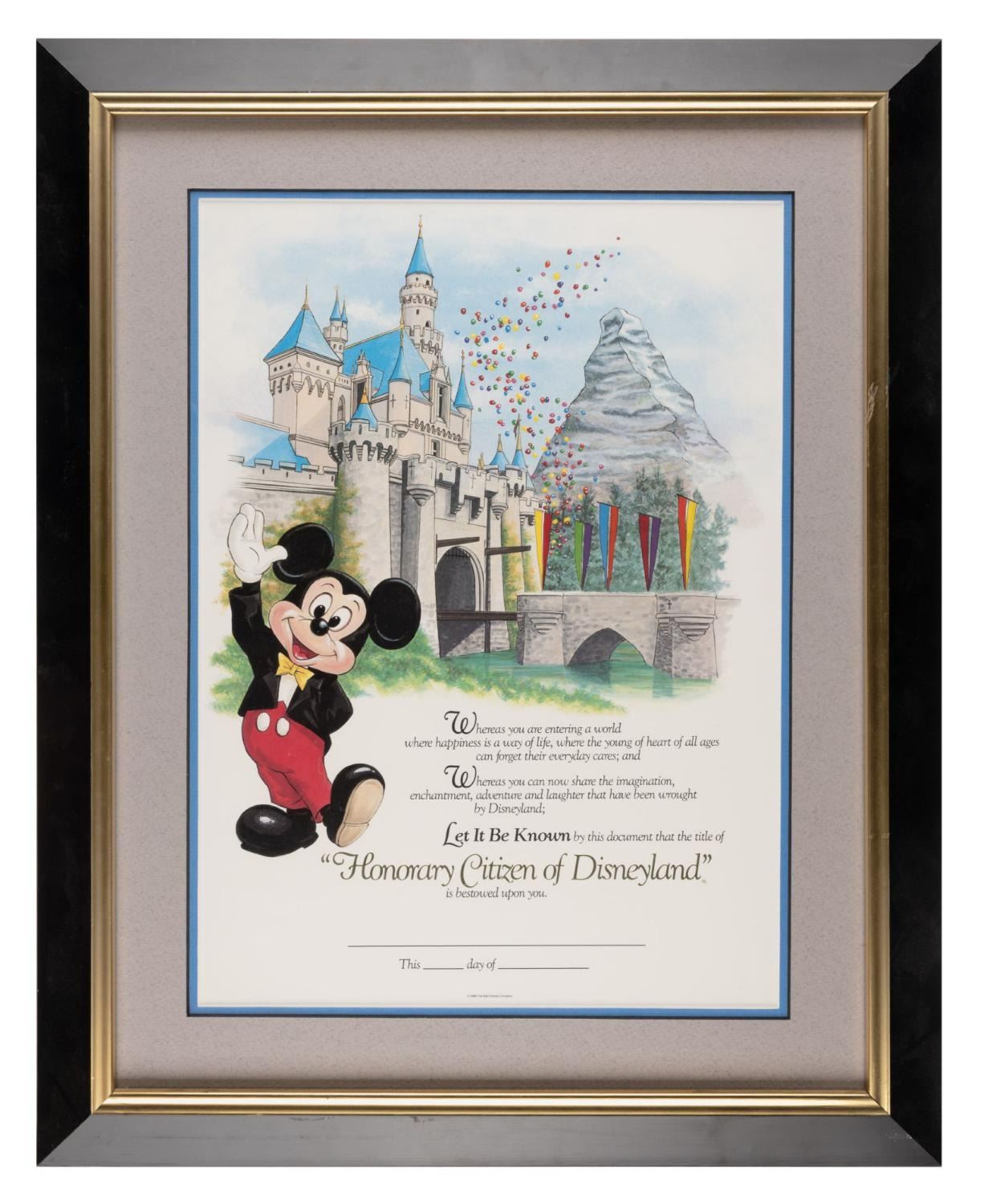 (Disneyland, 1988) A framed, unused Disneyland Honorary Citizen Certificate “bestowed upon” Guests who answered Disney-themed trivia questions correctly or performed good deeds in the Park. This certificate features Mickey Mouse waving in front of Sleeping Beauty Castle and the Matterhorn. Measuring 14.5” x 10.5” in a 20.75” x 16.5” frame, the certificate is in fine condition, while the frame displays light scuffs to the molding.
