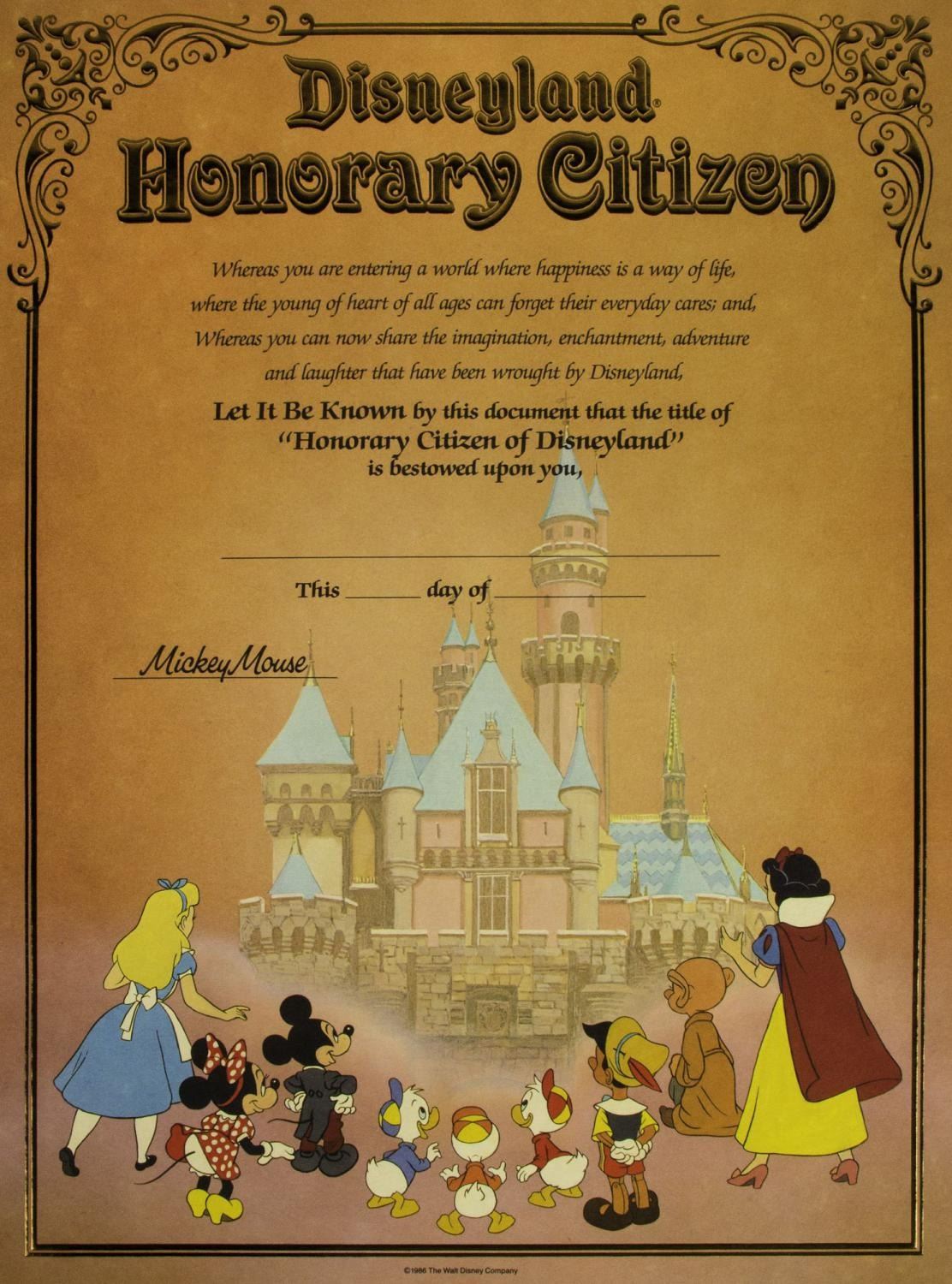 (Disneyland, 1986) A Disneyland Honorary Citizen Certificate “bestowed upon” Guests who answered Disney-themed trivia questions correctly or performed good deeds in the Park. Measuring 14.75” x 11”, the Park ephemera is in very good condition.