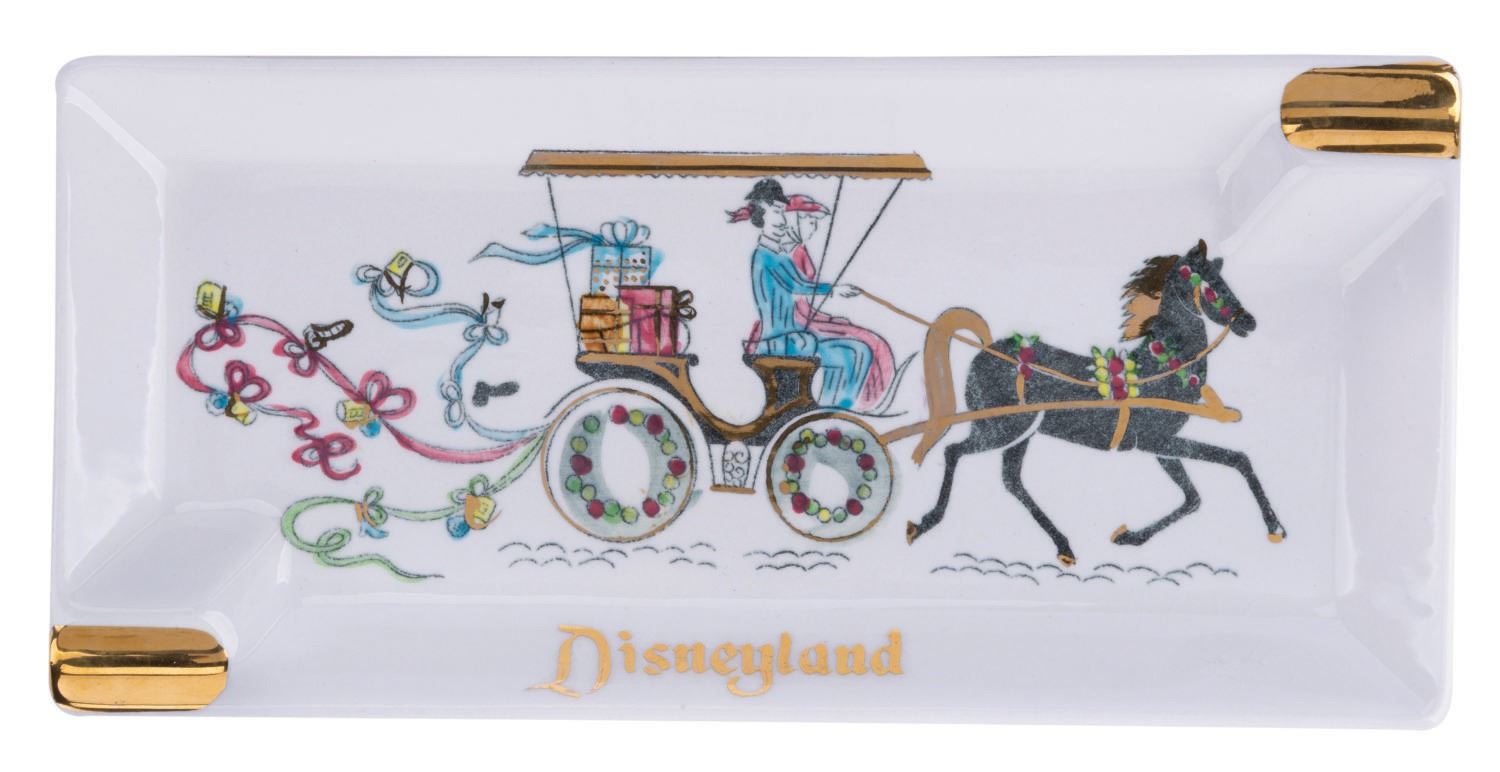 (Disneyland, 1960s) A large souvenir ceramic ashtray from Disneyland. The ashtray features two holders with delicately applied hand-painted gold-leaf accents. Measuring 9"x4.25", the ashtray is in fine condition.