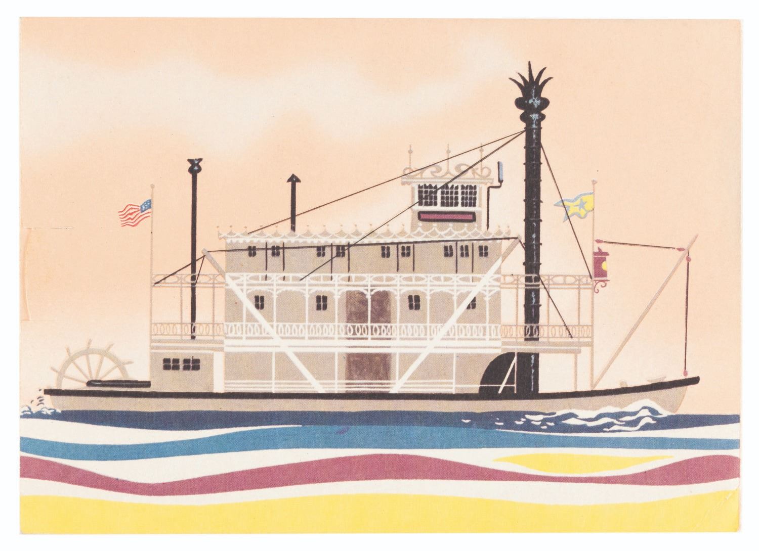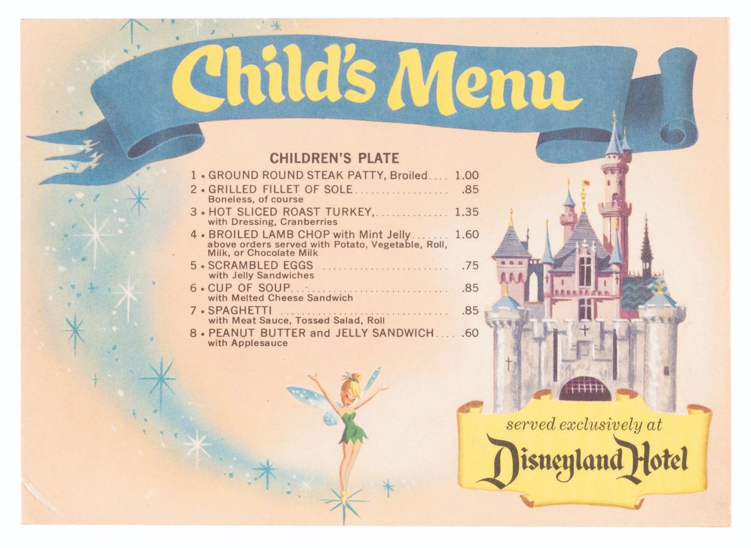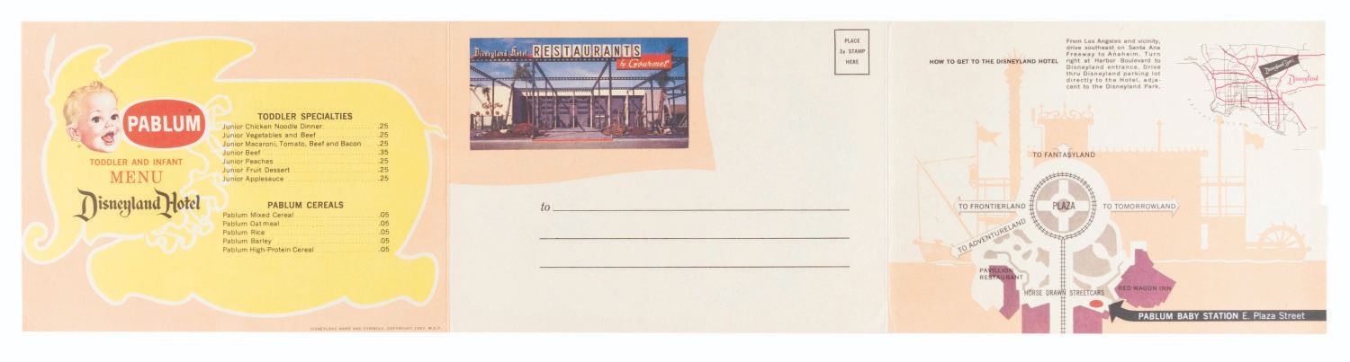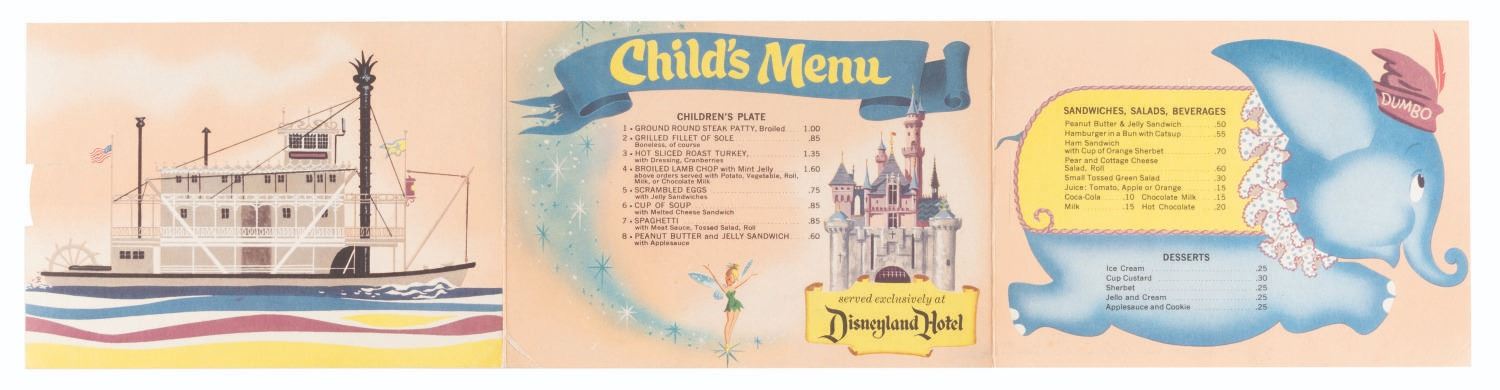 (Disneyland Hotel, 1957) A very early children's menu from the Disneyland Hotel featuring illustrations of the Mark Twain Riverboat, Dumbo, and Tinker Bell. Created to be mailed like a postcard, it has an unused section for a stamp and address. The menu measures 5" x 7" and is in very good condition with some edge wear and a .5” crease at the bottom right corner.