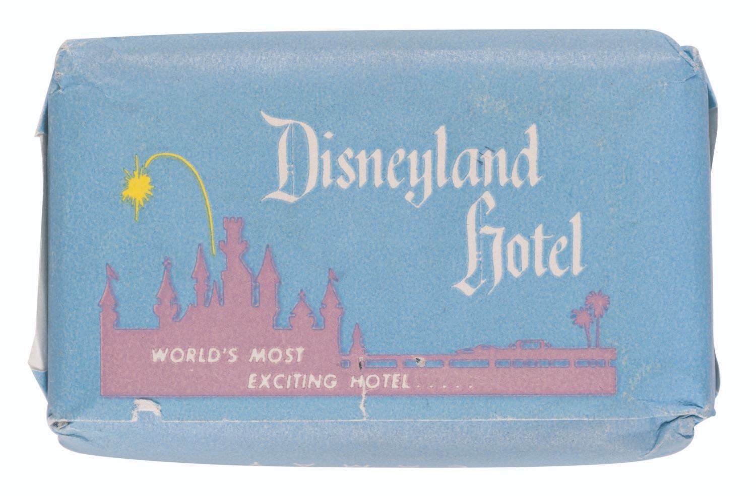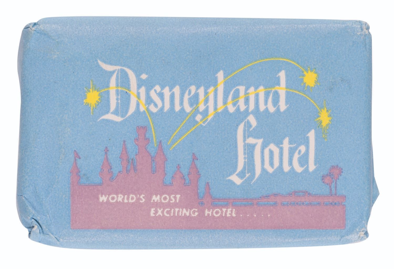 (Disneyland, 1950s) A Disneyland Hotel bar of soap, manufactured by Camay Products. Measuring 2.5” x 1.5”, the soap and packaging is in very good condition with minor scuffs and wear to the corners and edges of the paper.