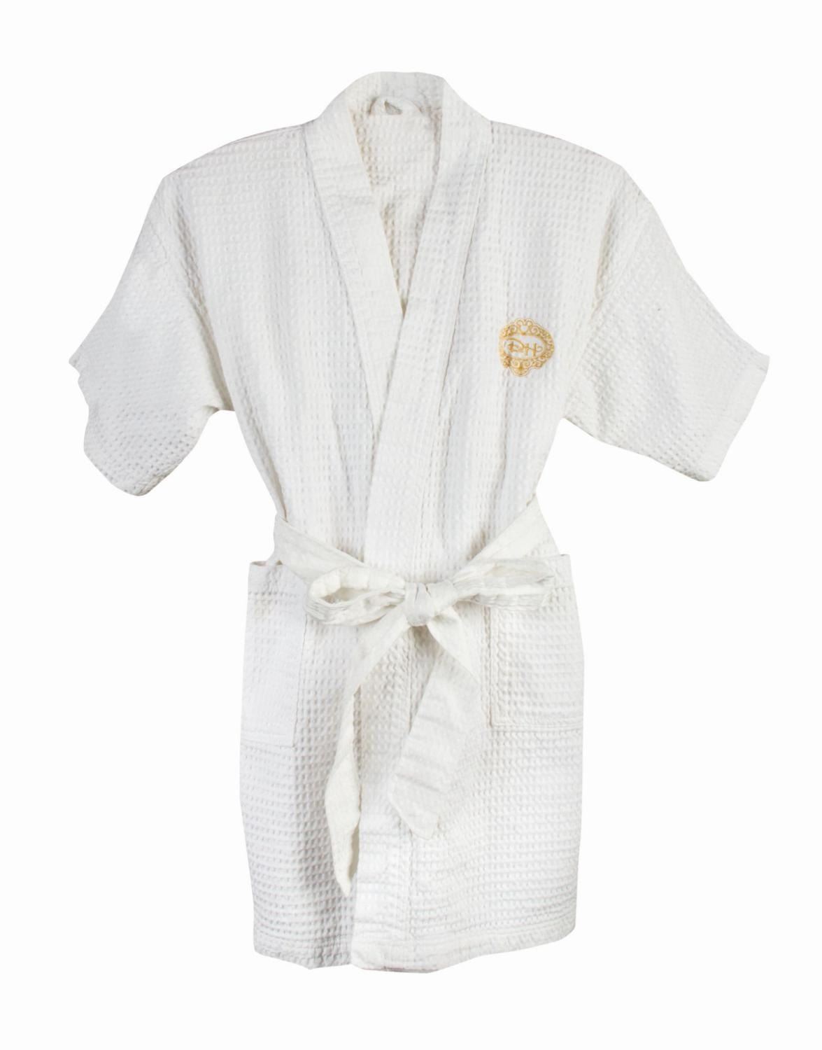 (Disneyland Hotel, 2000s) A white youth bathrobe from the Disneyland Hotel featuring the hotel logo on the left side of the chest. The bathrobe is in fine condition.