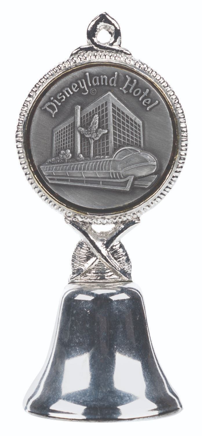 (Disneyland Hotel, 1960s-70s) A souvenir bell from the Disneyland Hotel, featuring a relief of the Hotel and the Monorail. Measuring 1.5” in diameter and 3.75” tall, the bell is in fine condition.