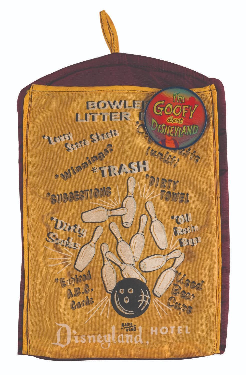 (Disneyland/Disneyland Hotel, 1960s-70s) A souvenir Bowler's Litter Bag souvenir and an original Art Corner Vari-Vue lenticular pinback button featuring Goofy. Measuring 8.25" x 12.25", the bag is in good condition with light wear from handling and age. The 2.5" in diameter button is in good condition with fading, scuffs, and handling wear.