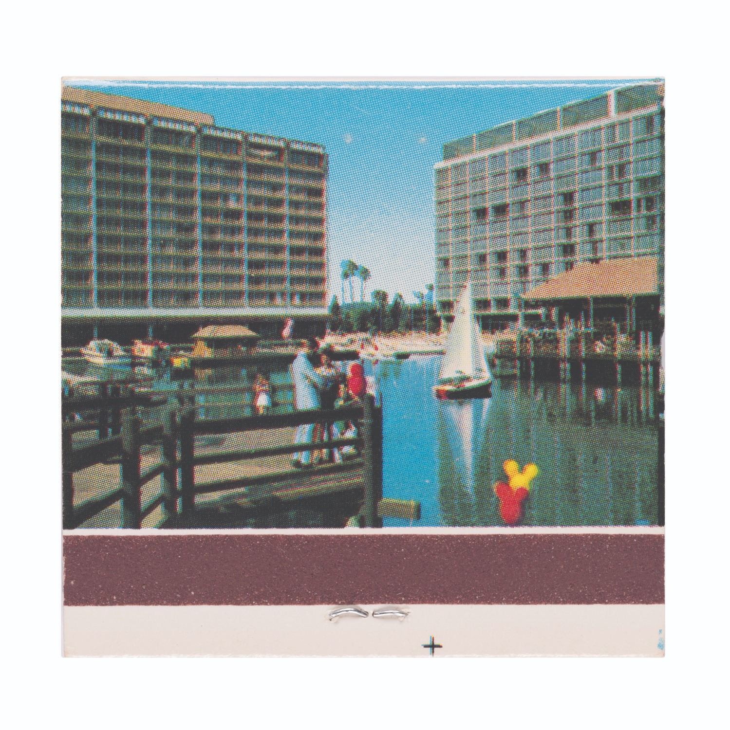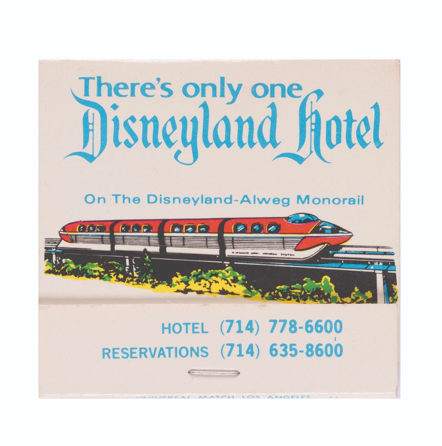 (Disneyland Hotel, 1970s) A complimentary matchbook from the Disneyland Hotel featuring the Monorail and Marina. Measuring 2" x 2", the piece is in very good condition with a few faint impressions from the match heads, light fading, and wear.