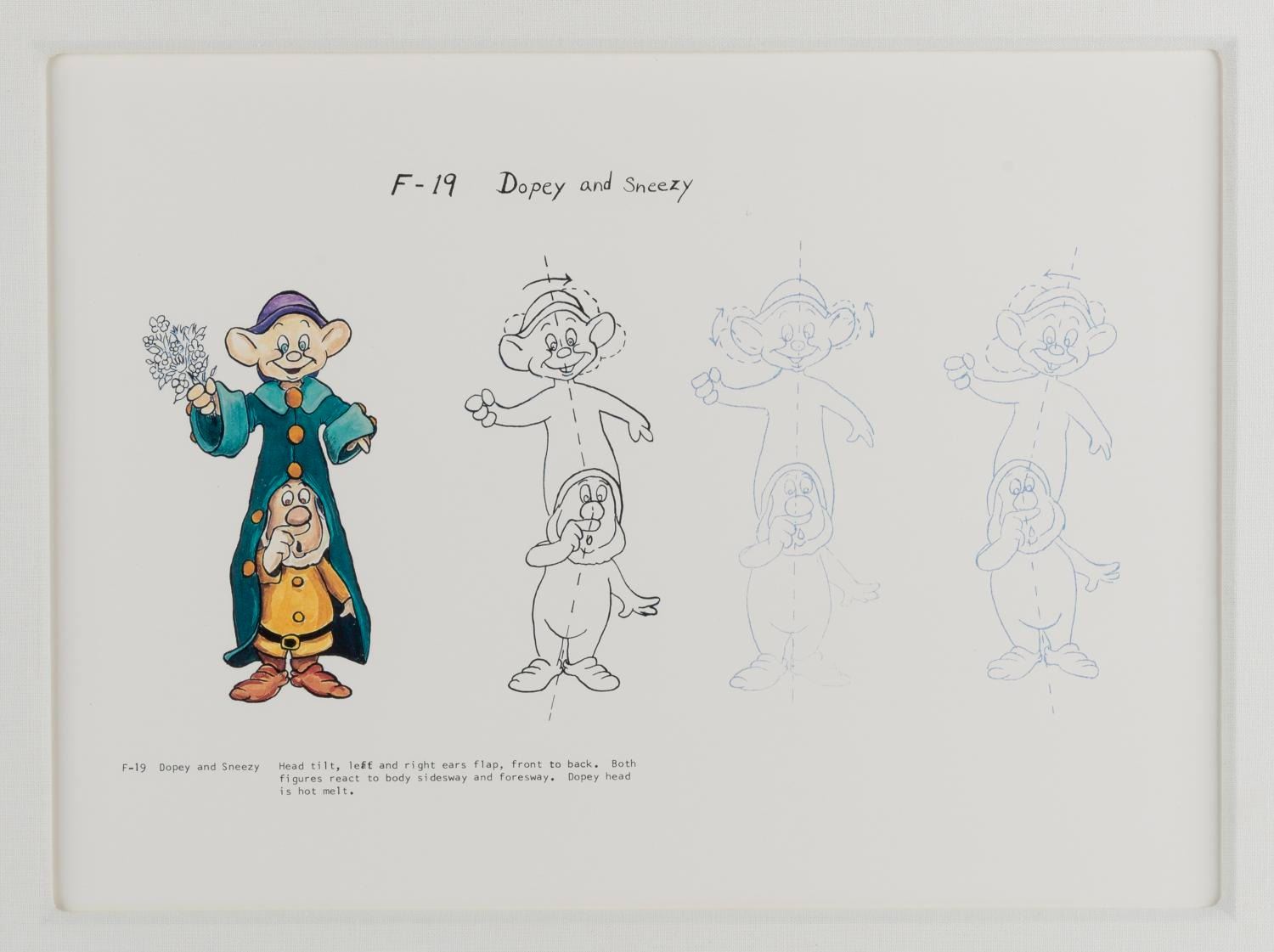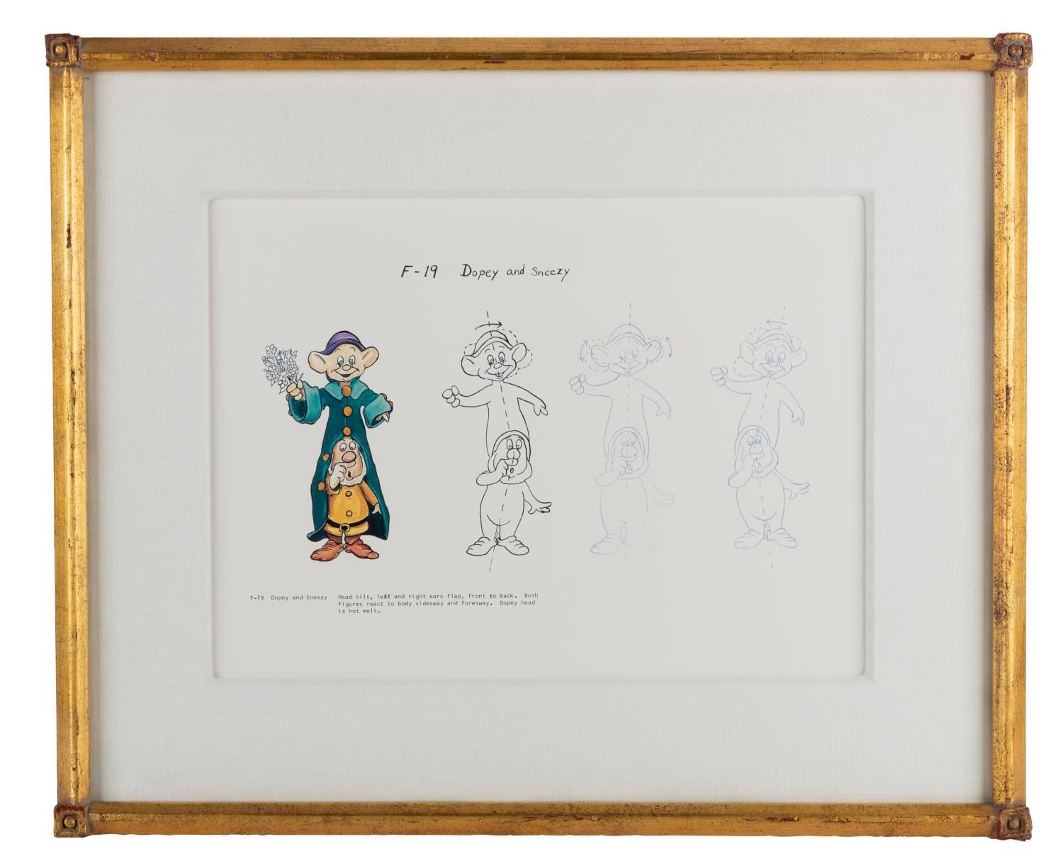 (Disneyland Hotel, 2000s) A Dopey and Sneezy framed print. This piece was created for the Disneyland Hotel Fantasy Tower. The print depicts the animation of the Dopey and Sneezy Audio-Animatronics simple figures from Snow White's Scary Adventures at Disneyland. The piece includes its original frame, measures 22.25"x18.25", and is in very good condition with scuffs and wear to the frame from Resort display.